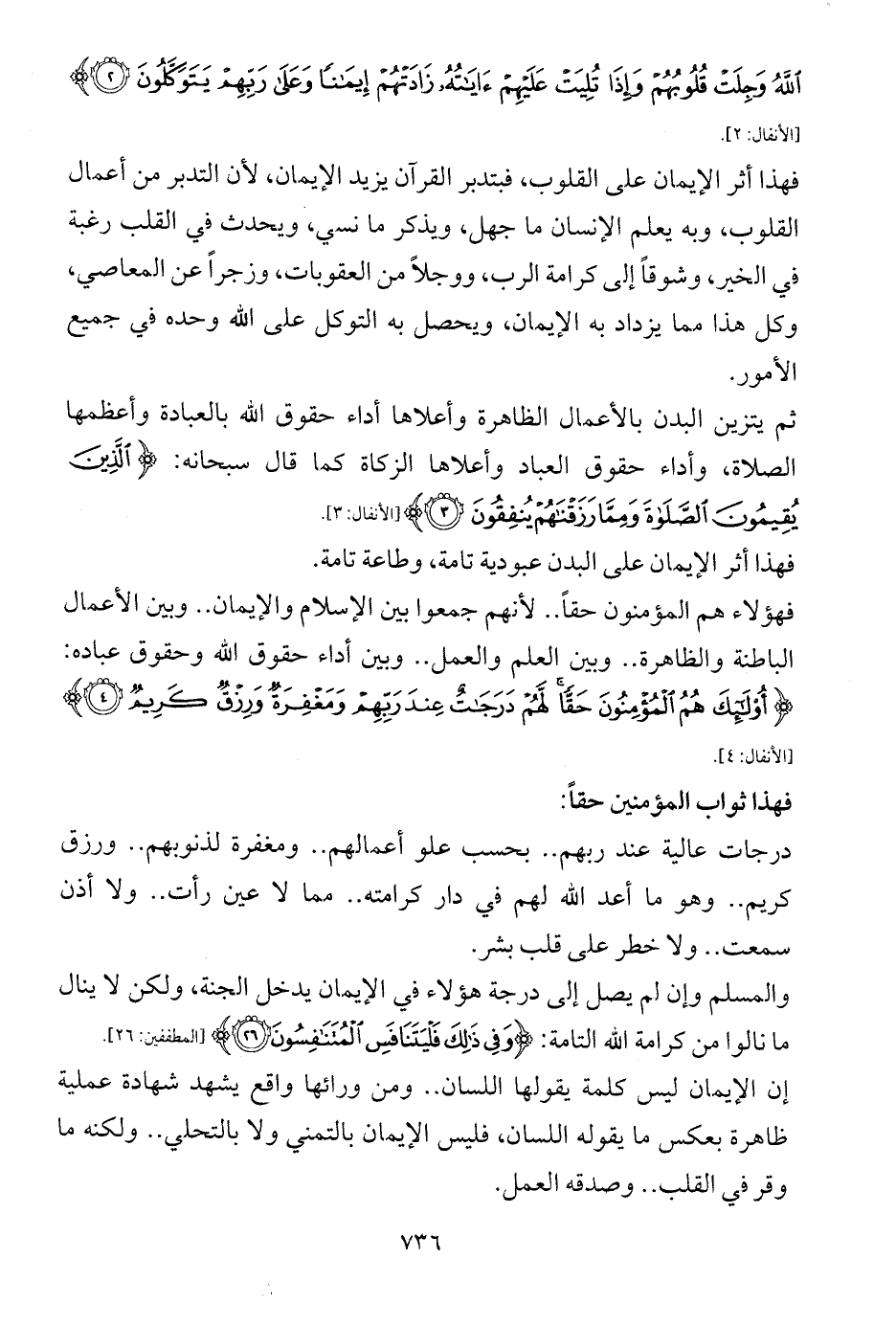فهذا أثر الإيمان على القلوب، فبتدبر القرآن يزيد الإيمان، لأن التدبر من أعمال القلوب، وبه يعلم الإنسان ما جهل، ويذكر ما نسي، ويحدث في القلب رغبة في الخير، وشوقاً إلى كرامة الرب، ووجلاً من العقوبات، وزجراً عن المعاصي، وكل هذا مما يزداد به الإيمان، ويحصل به التوكل على الله وحده في جميع الأمور.
