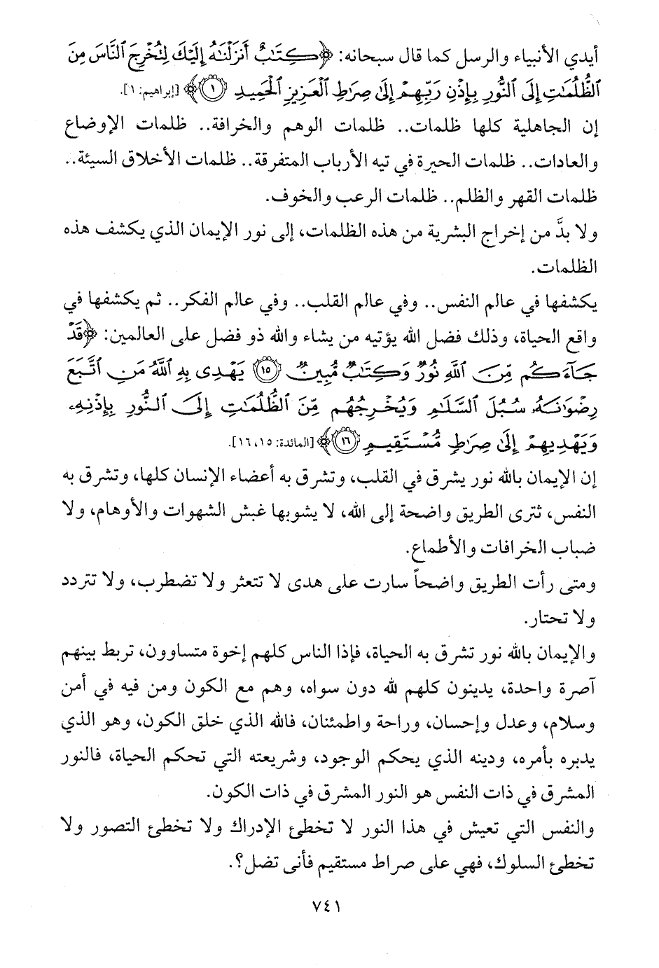 والإيمان بالله نور تشرق به الحياة، فإذا الناس كلهم إخوة متساوون، تربط بينهم آصرة واحدة، يدينون كلهم لله دون سواه، وهم مع الكون ومن فيه في أمن وسلام، وعدل وإحسان، وراحة واطمئنان، فالله الذي خلق الكون، وهو الذي يدبره بأمره، ودينه الذي يحكم الوجود، وشريعته التي تحكم الحياة، فالنور المشرق في ذات النفس هو النور المشرق في ذات الكون.