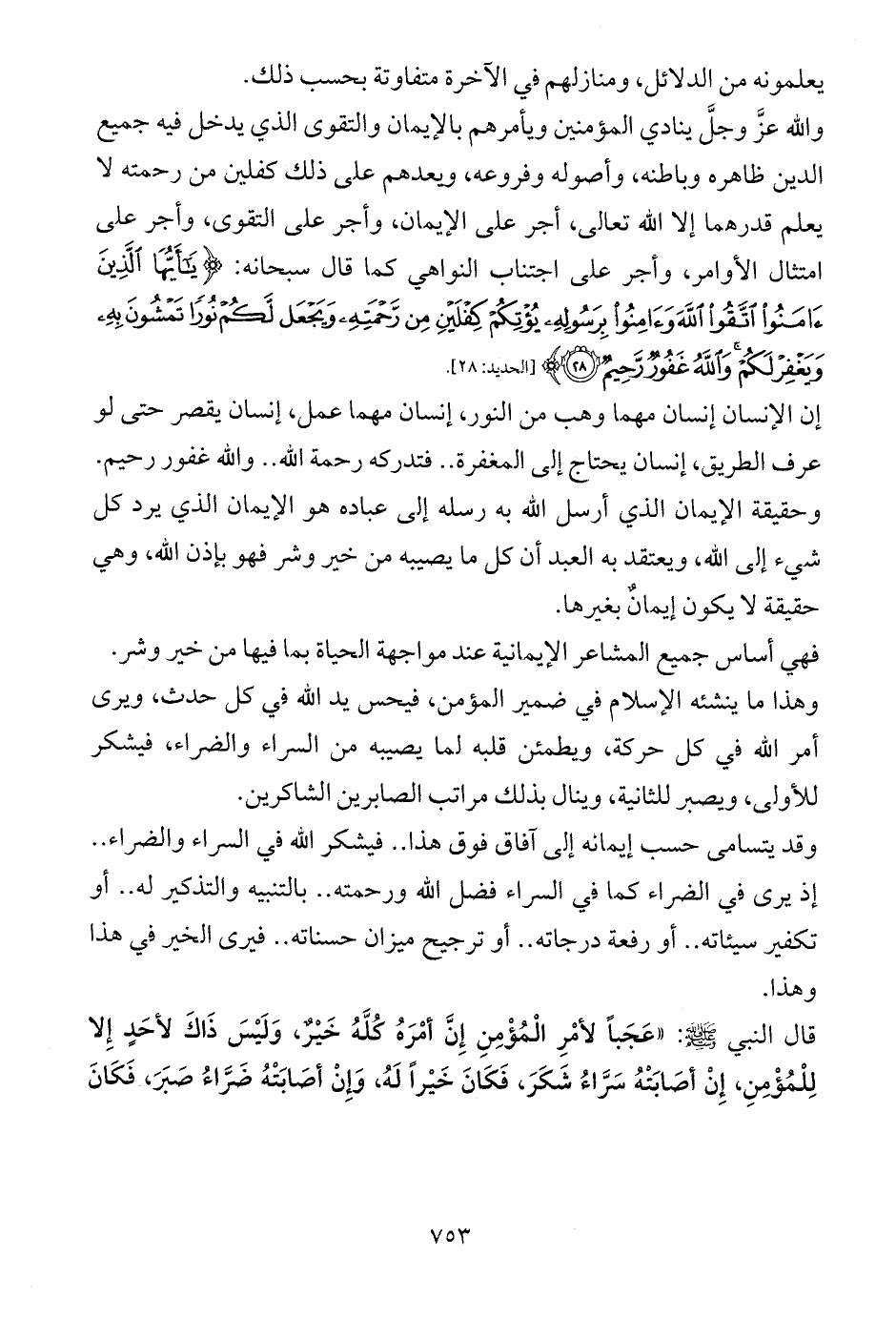 وهذا ما ينشئه الإسلام في ضمير المؤمن، فيحس يد الله في كل حدث، ويرى أمر الله في كل حركة، ويطمئن قلبه لما يصيبه من السراء والضراء، فيشكر للأولى، ويصبر للثانية، وينال بذلك مراتب الصابرين الشاكرين.