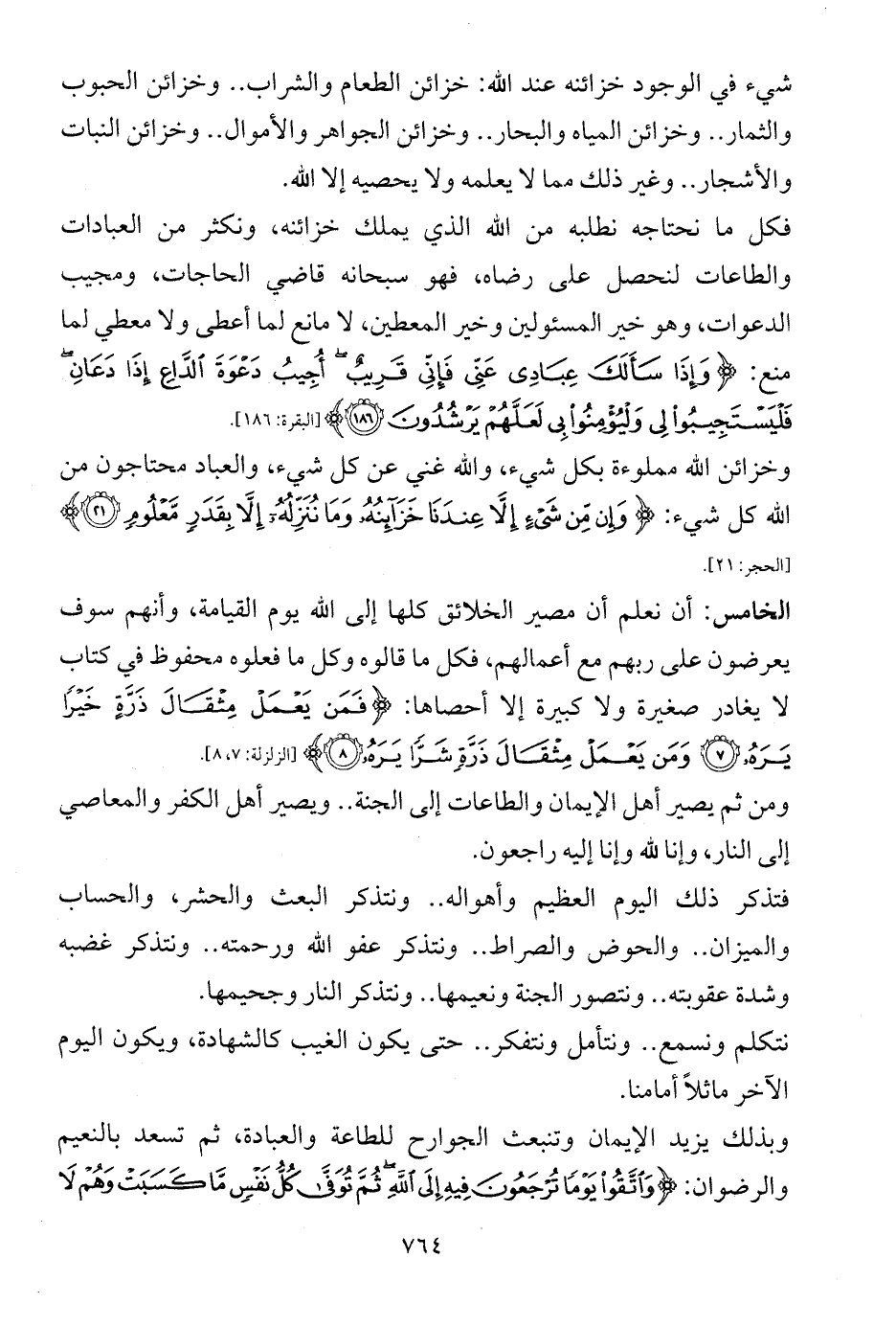 الخامس: أن نعلم أن مصير الخلائق كلها إلى الله يوم القيامة، وأنهم سوف يعرضون على ربهم مع أعمالهم، فكل ما قالوه وكل ما فعلوه محفوظ في كتاب لا يغادر صغيرة ولا كبيرة إلا أحصاها: {فَمَنْ يَعْمَلْ مِثْقَالَ ذَرَّةٍ خَيْرًا يَرَهُ (7) وَمَنْ يَعْمَلْ مِثْقَالَ ذَرَّةٍ شَرًّا يَرَهُ (8)} [الزلزلة: 7، 8].