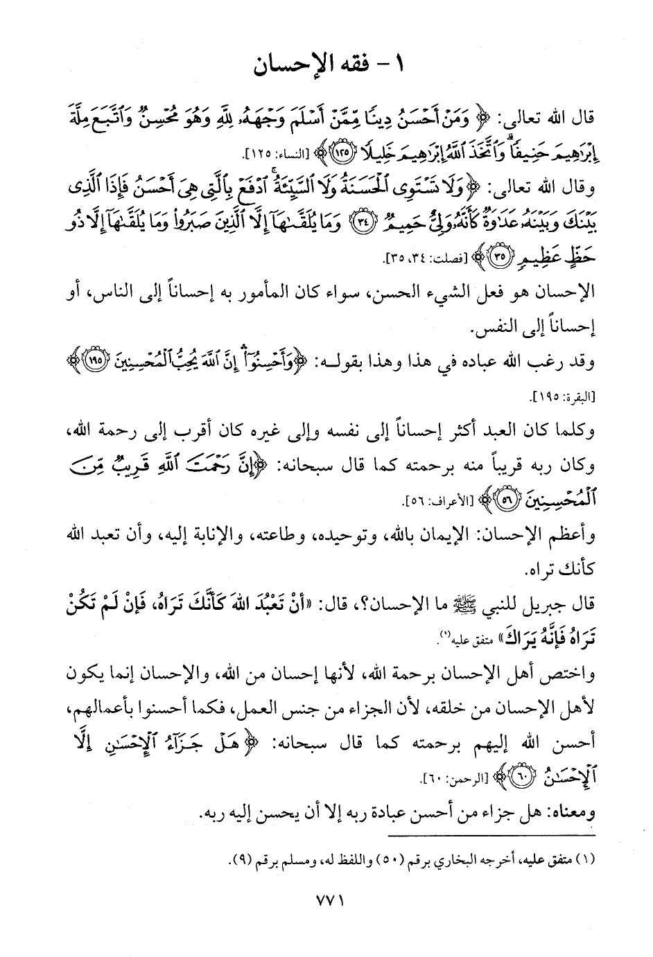 وأعظم الإحسان: الإيمان بالله، وتوحيده، وطاعته، والإنابة إليه، وأن تعبد الله كأنك تراه.