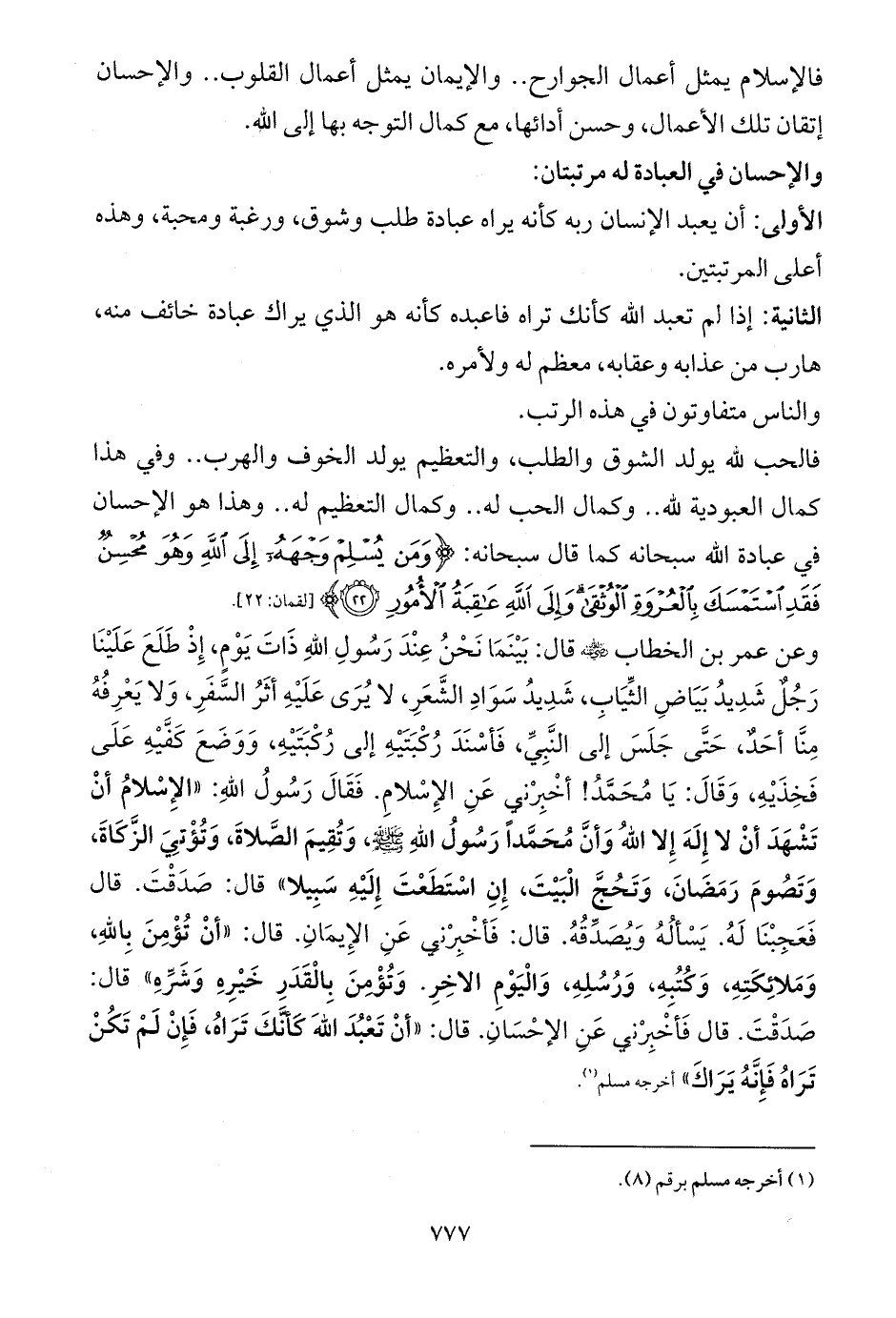 وعن عمر بن الخطاب - رضي الله عنه - قال: بَيْنَمَا نَحْنُ عِنْدَ رَسُولِ اللهِ ذَاتَ يَوْمٍ، إِذْ طَلَعَ عَلَيْنَا رَجُلٌ شَدِيدُ بَيَاضِ الثِّيَابِ، شَدِيدُ سَوَادِ الشَّعَرِ، لا يُرَى عَلَيْهِ أثَرُ السَّفَرِ، وَلا يَعْرِفُهُ مِنَّا أحَدٌ، حَتَّى جَلَسَ إلى النَّبِيِّ، فَأسْنَدَ رُكْبَتَيْهِ إلى رُكْبَتَيْهِ، وَوَضَعَ كَفَّيْهِ عَلَى فَخِذَيْهِ، وَقَالَ: يَا مُحَمَّدُ! أخْبِرْنِي عَنِ الإِسْلامِ. فَقَالَ رَسُولُ اللهِ: «الإِسْلامُ أنْ تَشْهَدَ أنْ لا إِلَهَ إِلا اللهُ وَأنَّ مُحَمَّداً رَسُولُ اللهِ - صلى الله عليه وسلم -، وَتُقِيمَ الصَّلاةَ، وَتُؤْتِيَ الزَّكَاةَ، وَتَصُومَ رَمَضَانَ، وَتَحُجَّ الْبَيْتَ، إِنِ اسْتَطَعْتَ إِلَيْهِ سَبِيلا» قال: صَدَقْتَ. قال فَعَجِبْنَا لَهُ. يَسْألُهُ وَيُصَدِّقُهُ. قال: فَأخْبِرْنِي عَنِ الإِيمَانِ. قال: «أنْ تُؤْمِنَ بِاللهِ، وَمَلائِكَتِهِ، وَكُتُبِهِ، وَرُسُلِهِ، وَالْيَوْمِ الاخِرِ. وَتُؤْمِنَ بِالْقَدَرِ خَيْرِهِ وَشَرِّهِ» قال: صَدَقْتَ. قال فَأخْبِرْنِي عَنِ الإحْسَانِ. قال: «أنْ تَعْبُدَ اللهَ كَأنَّكَ تَرَاهُ، فَإِنْ لَمْ تَكُنْ تَرَاهُ فَإِنَّهُ يَرَاكَ» أخرجه مسلم (¬1).