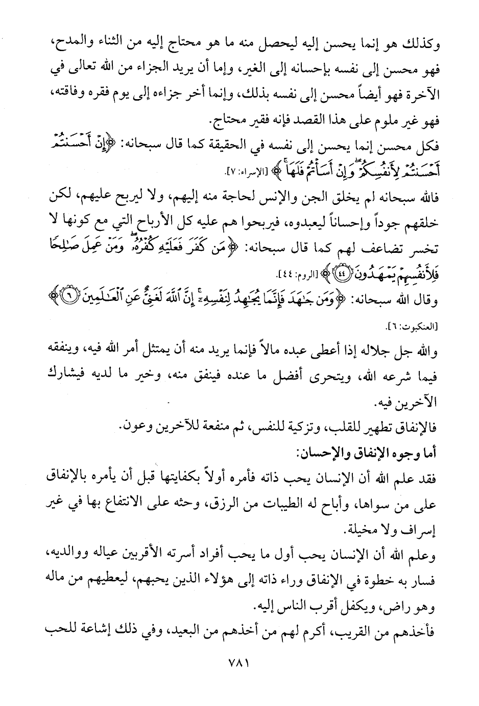 وكذلك هو إنما يحسن إليه ليحصل منه ما هو محتاج إليه من الثناء والمدح، فهو محسن إلى نفسه بإحسانه إلى الغير، وإما أن يريد الجزاء من الله تعالى في الآخرة فهو أيضاً محسن إلى نفسه بذلك، وإنما أخر جزاءه إلى يوم فقره وفاقته، فهو غير ملوم على هذا القصد فإنه فقير محتاج.