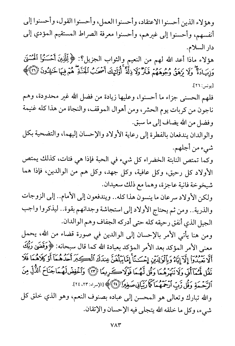ومن هنا يأتي الأمر بالإحسان إلى الوالدين في صورة قضاء من الله، يحمل معنى الأمر المؤكد بعد الأمر المؤكد بعبادة الله كما قال سبحانه: {وَقَضَى رَبُّكَ أَلَّا تَعْبُدُوا إِلَّا إِيَّاهُ وَبِالْوَالِدَيْنِ إِحْسَانًا إِمَّا يَبْلُغَنَّ عِنْدَكَ الْكِبَرَ أَحَدُهُمَا أَوْ كِلَاهُمَا فَلَا تَقُلْ لَهُمَا أُفٍّ وَلَا تَنْهَرْهُمَا وَقُلْ لَهُمَا قَوْلًا كَرِيمًا (23) وَاخْفِضْ لَهُمَا جَنَاحَ الذُّلِّ مِنَ الرَّحْمَةِ وَقُلْ رَبِّ ارْحَمْهُمَا كَمَا رَبَّيَانِي صَغِيرًا (24)} [الإسراء: 23، 24].