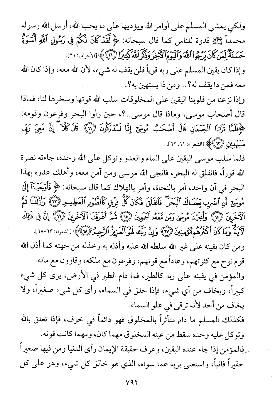 وإذا نزعنا من قلوبنا اليقين على المخلوقات سلب الله قوتها وسخرها لنا، فماذا قال أصحاب موسى، وماذا قال موسى .. ؟، حين رأوا البحر وفرعون وقومه: {فَلَمَّا تَرَاءَى الْجَمْعَانِ قَالَ أَصْحَابُ مُوسَى إِنَّا لَمُدْرَكُونَ (61) قَالَ كَلَّا إِنَّ مَعِيَ رَبِّي سَيَهْدِينِ (62)} [الشعراء: 61، 62].