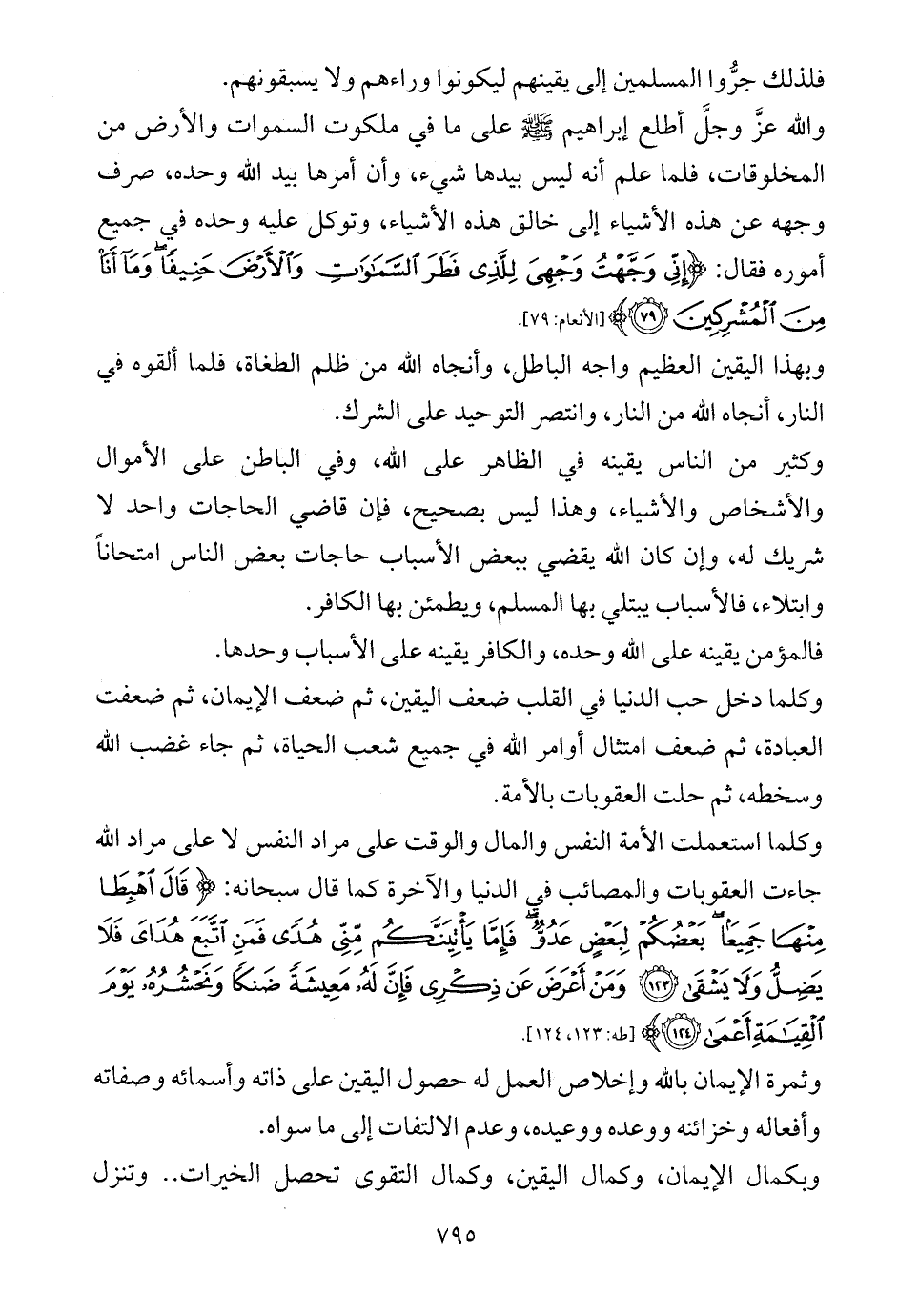 والله عزَّ وجلَّ أطلع إبراهيم - صلى الله عليه وسلم - على ما في ملكوت السموات والأرض من المخلوقات، فلما علم أنه ليس بيدها شيء، وأن أمرها بيد الله وحده، صرف وجهه عن هذه الأشياء إلى خالق هذه الأشياء، وتوكل عليه وحده في جميع أموره فقال: {إِنِّي وَجَّهْتُ وَجْهِيَ لِلَّذِي فَطَرَ السَّمَاوَاتِ وَالْأَرْضَ حَنِيفًا وَمَا أَنَا مِنَ الْمُشْرِكِينَ (79)} [الأنعام: 79].
