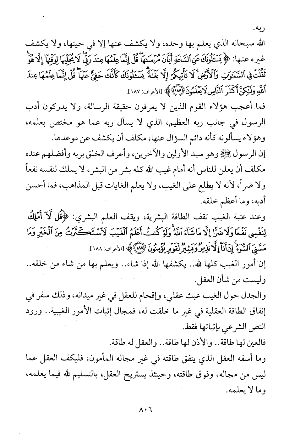 إن الرسول - صلى الله عليه وسلم - وهو سيد الأولين والآخرين، وأعرف الخلق بربه وأفضلهم عنده مكلف أن يعلن للناس أنه أمام غيب الله كله بشر من البشر، لا يملك لنفسه نفعاً ولا ضراً، لأنه لا يطلع على الغيب، ولا يعلم الغايات قبل المذاهب، فما أحسن أدبه، وما أعظم خلقه.