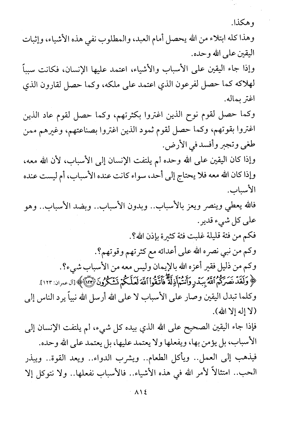 وإذا جاء اليقين على الأسباب والأشياء، اعتمد عليها الإنسان، فكانت سبباً لهلاكه كما حصل لفرعون الذي اعتمد على ملكه، وكما حصل لقارون الذي اغتر بماله.