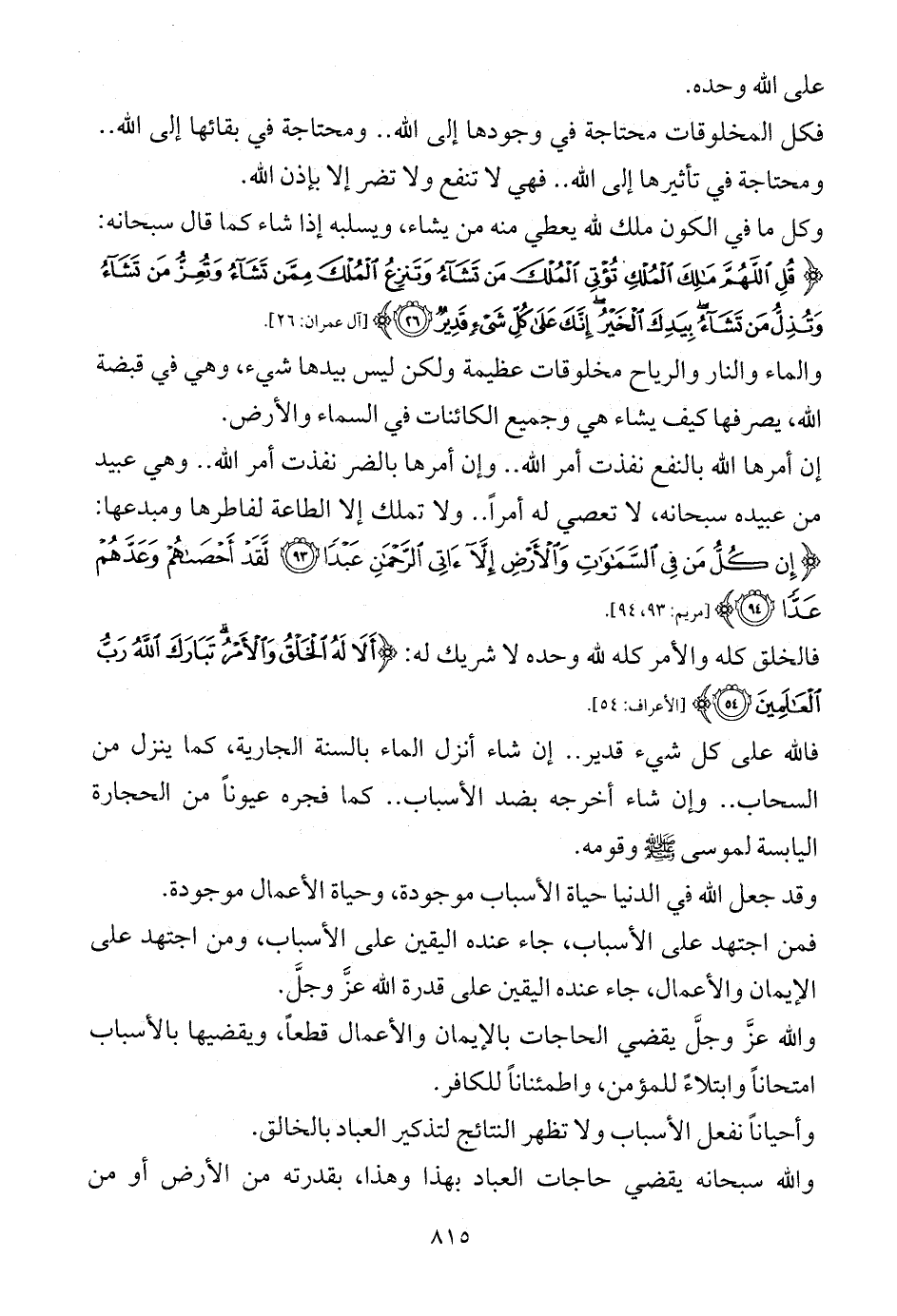 فكل المخلوقات محتاجة في وجودها إلى الله .. ومحتاجة في بقائها إلى الله .. ومحتاجة في تأثيرها إلى الله .. فهي لا تنفع ولا تضر إلا بإذن الله.