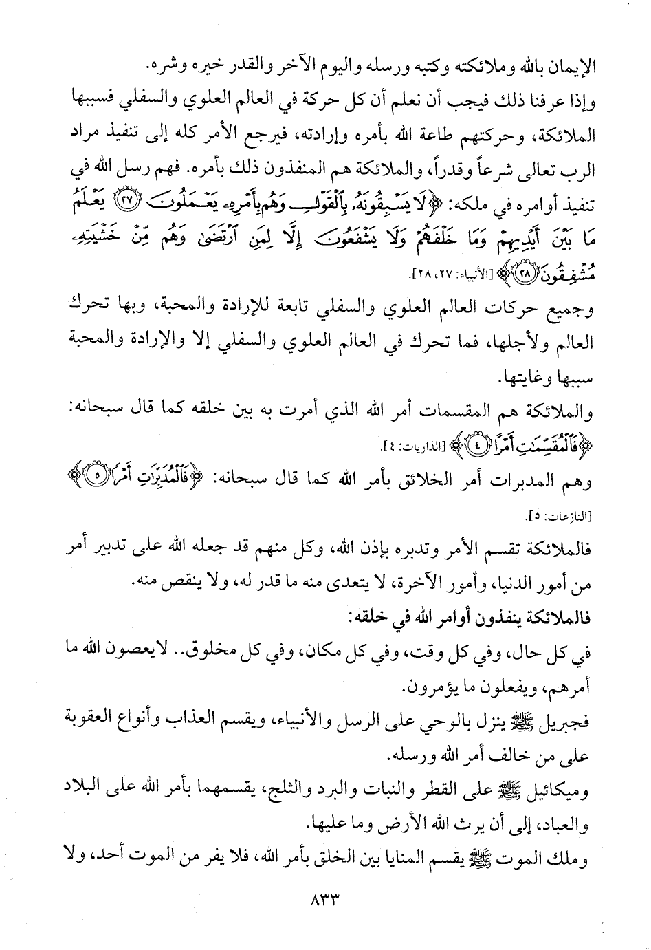 وإذا عرفنا ذلك فيجب أن نعلم أن كل حركة في العالم العلوي والسفلي فسببها الملائكة، وحركتهم طاعة الله بأمره وإرادته، فيرجع الأمر كله إلى تنفيذ مراد الرب تعالى شرعاً وقدراً، والملائكة هم المنفذون ذلك بأمره. فهم رسل الله في تنفيذ أوامره في ملكه: {لَا يَسْبِقُونَهُ بِالْقَوْلِ وَهُمْ بِأَمْرِهِ يَعْمَلُونَ (27) يَعْلَمُ مَا بَيْنَ أَيْدِيهِمْ وَمَا خَلْفَهُمْ وَلَا يَشْفَعُونَ إِلَّا لِمَنِ ارْتَضَى وَهُمْ مِنْ خَشْيَتِهِ مُشْفِقُونَ (28)} [الأنبياء: 27، 28].