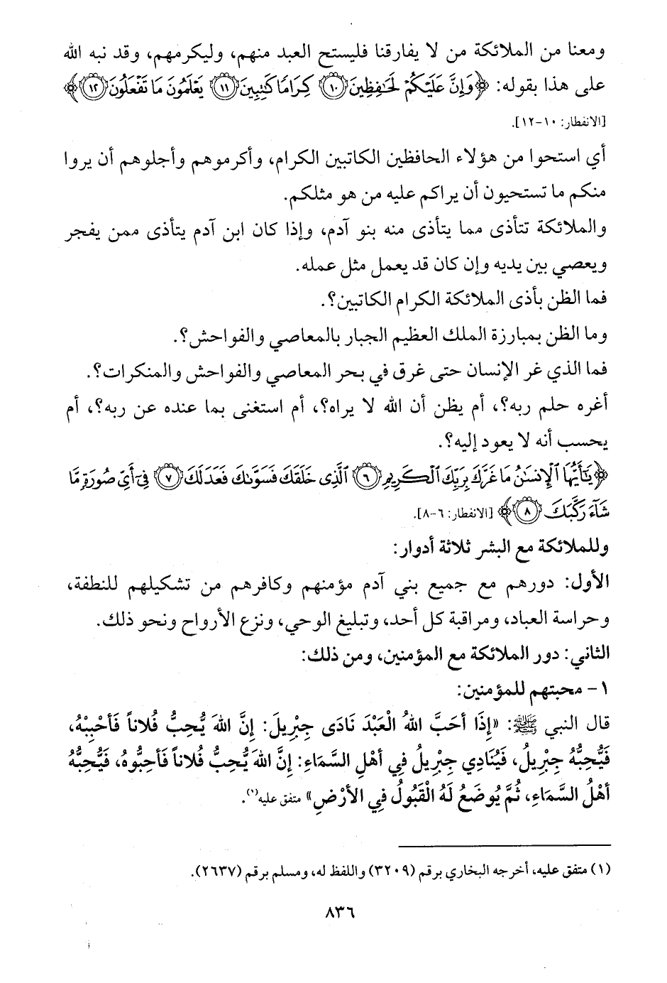 الأول: دورهم مع جميع بني آدم مؤمنهم وكافرهم من تشكيلهم للنطفة، وحراسة العباد، ومراقبة كل أحد، وتبليغ الوحي، ونزع الأرواح ونحو ذلك.
