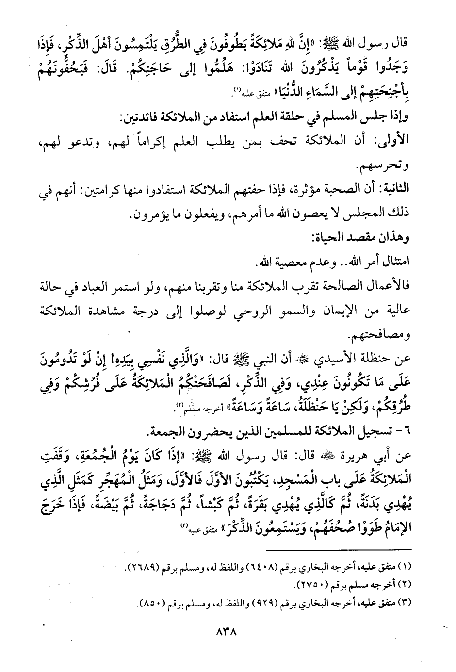 عن أبي هريرة - رضي الله عنه - قال: قال رسول الله - صلى الله عليه وسلم -: «إذَا كَانَ يَوْمُ الْجُمُعَةِ، وَقَفَتِ الْمَلائِكَةُ عَلَى باب الْمَسْجِدِ، يَكْتُبُونَ الأوَّلَ فَالأوَّلَ، وَمَثَلُ الْمُهَجِّرِ كَمَثَلِ الَّذِي يُهْدِي بَدَنَةً، ثُمَّ كَالَّذِي يُهْدِي بَقَرَةً، ثُمَّ كَبْشاً، ثُمَّ دَجَاجَةً، ثُمَّ بَيْضَةً، فَإذَا خَرَجَ الإمَامُ طَوَوْا صُحُفَهُمْ، وَيَسْتَمِعُونَ الذِّكْرَ» متفق عليه (¬3).