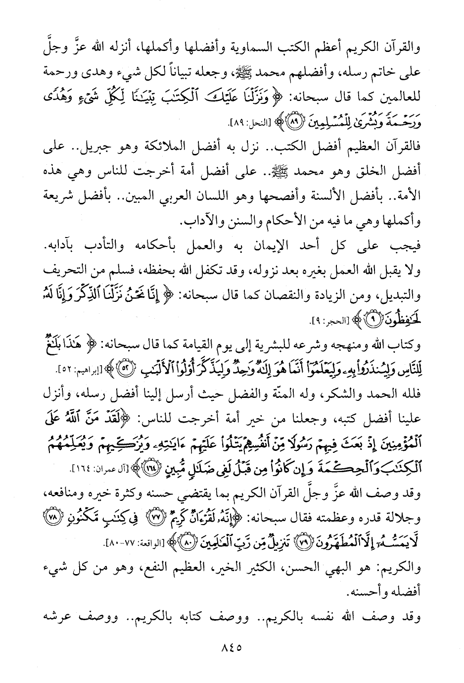 وقد وصف الله عزَّ وجلَّ القرآن الكريم بما يقتضي حسنه وكثرة خيره ومنافعه، وجلالة قدره وعظمته فقال سبحانه: {إِنَّهُ لَقُرْآنٌ كَرِيمٌ (77) فِي كِتَابٍ مَكْنُونٍ (78) لَا يَمَسُّهُ إِلَّا الْمُطَهَّرُونَ (79) تَنْزِيلٌ مِنْ رَبِّ الْعَالَمِينَ (80)} [الواقعة: 77 - 80].