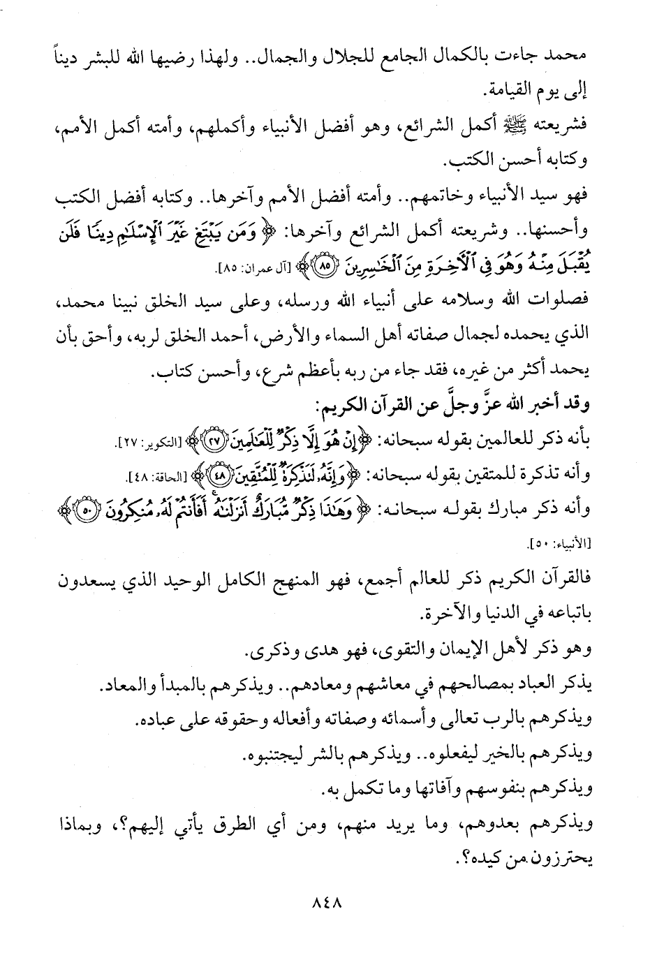 وأنه ذكر مبارك بقوله سبحانه: {وَهَذَا ذِكْرٌ مُبَارَكٌ أَنْزَلْنَاهُ أَفَأَنْتُمْ لَهُ مُنْكِرُونَ (50)} [الأنبياء: 50].
