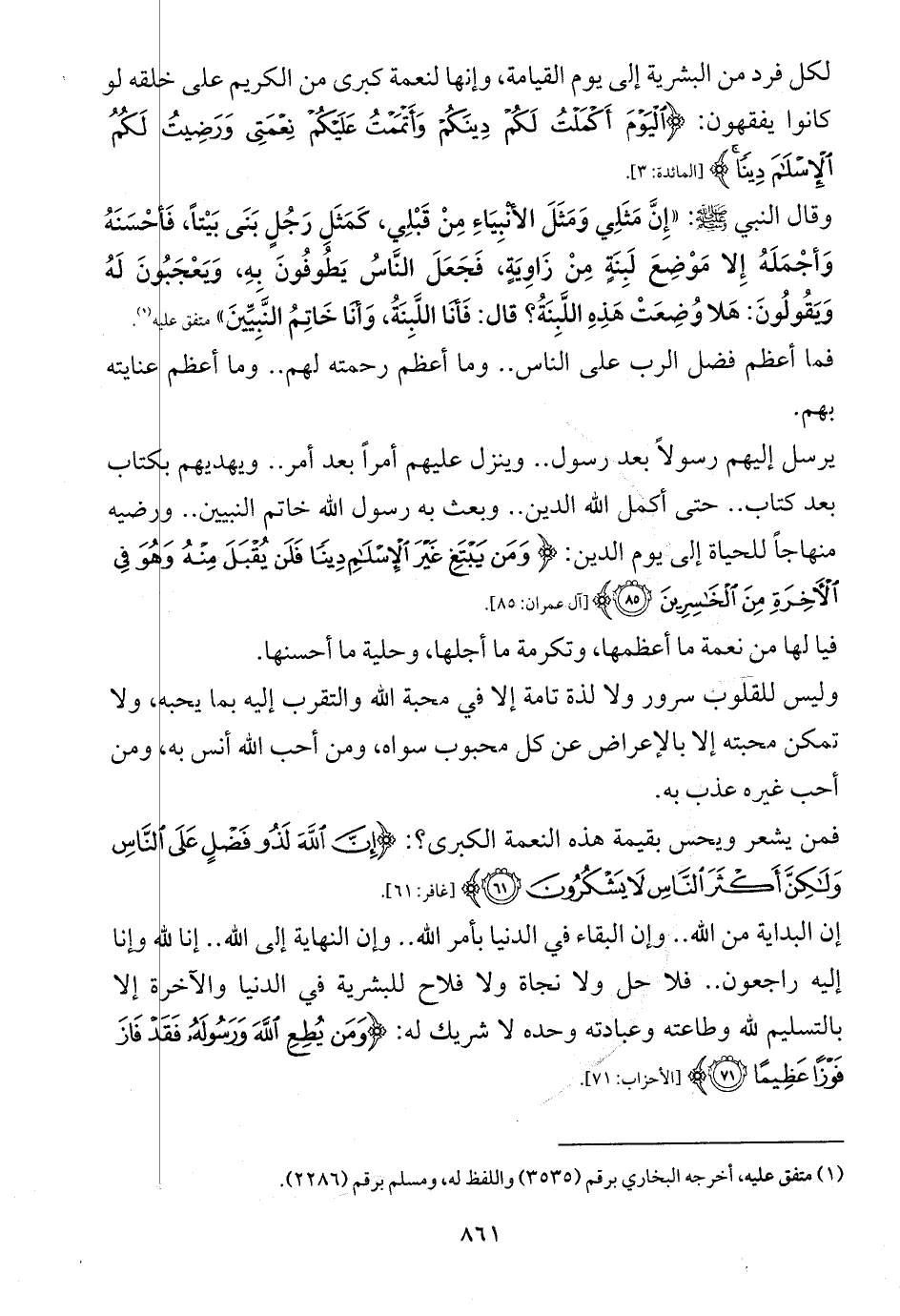 لكل فرد من البشرية إلى يوم القيامة، وإنها لنعمة كبرى من الكريم على خلقه لو كانوا يفقهون: {الْيَوْمَ أَكْمَلْتُ لَكُمْ دِينَكُمْ وَأَتْمَمْتُ عَلَيْكُمْ نِعْمَتِي وَرَضِيتُ لَكُمُ الْإِسْلَامَ دِينًا} [المائدة: 3].