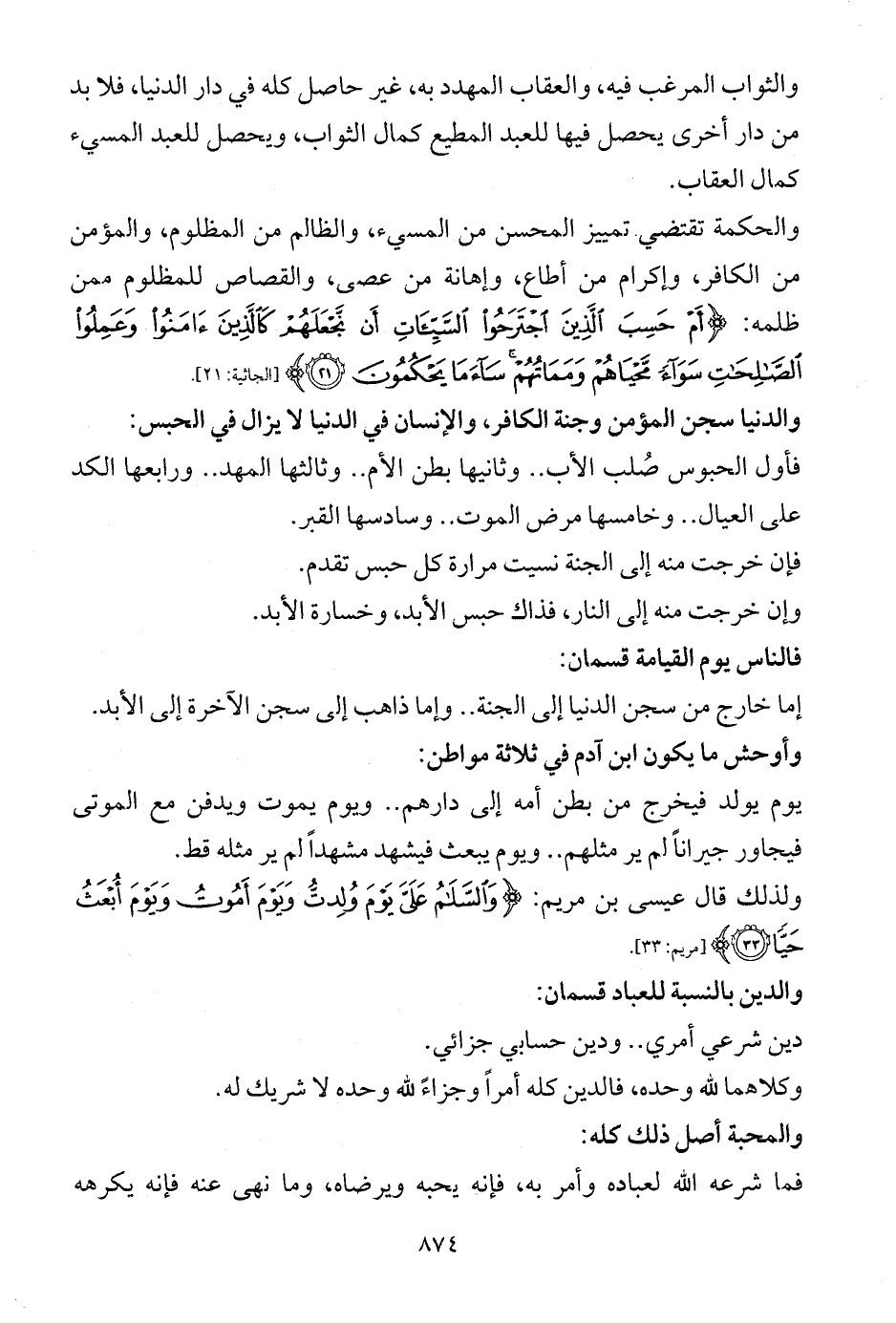 والثواب المرغب فيه، والعقاب المهدد به، غير حاصل كله في دار الدنيا، فلا بد من دار أخرى يحصل فيها للعبد المطيع كمال الثواب، ويحصل للعبد المسيء كمال العقاب.