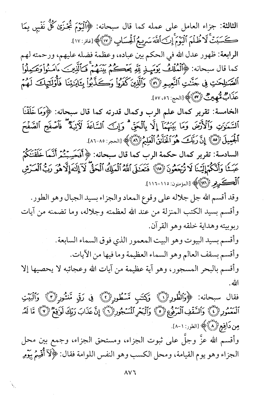 فقال سبحانه: {وَالطُّورِ (1) وَكِتَابٍ مَسْطُورٍ (2) فِي رَقٍّ مَنْشُورٍ (3) وَالْبَيْتِ الْمَعْمُورِ (4) وَالسَّقْفِ الْمَرْفُوعِ (5) وَالْبَحْرِ الْمَسْجُورِ (6) إِنَّ عَذَابَ رَبِّكَ لَوَاقِعٌ (7) مَا لَهُ مِنْ دَافِعٍ (8)} [الطور: 1 - 8].