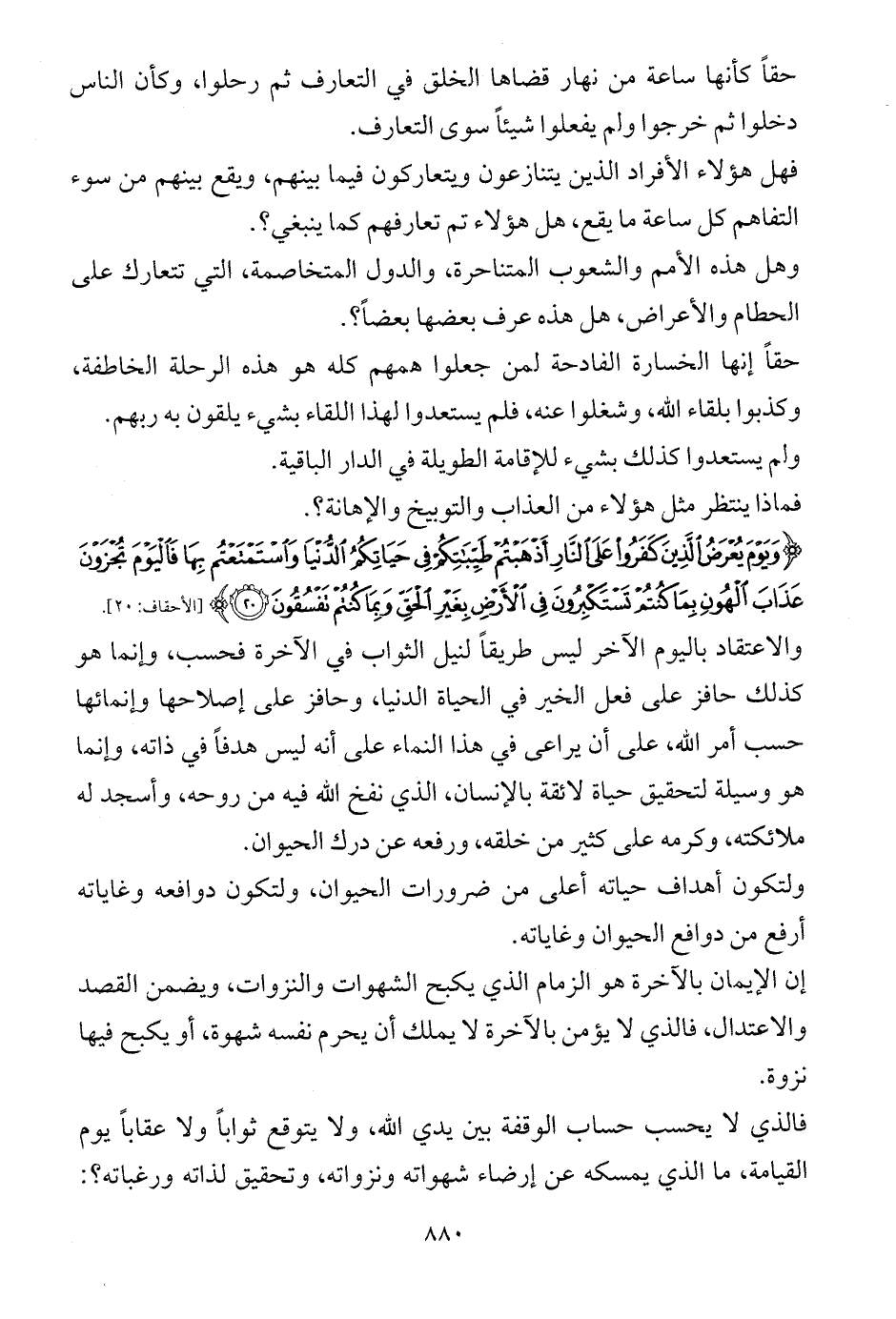 إن الإيمان بالآخرة هو الزمام الذي يكبح الشهوات والنزوات، ويضمن القصد والاعتدال، فالذي لا يؤمن بالآخرة لا يملك أن يحرم نفسه شهوة، أو يكبح فيها نزوة.