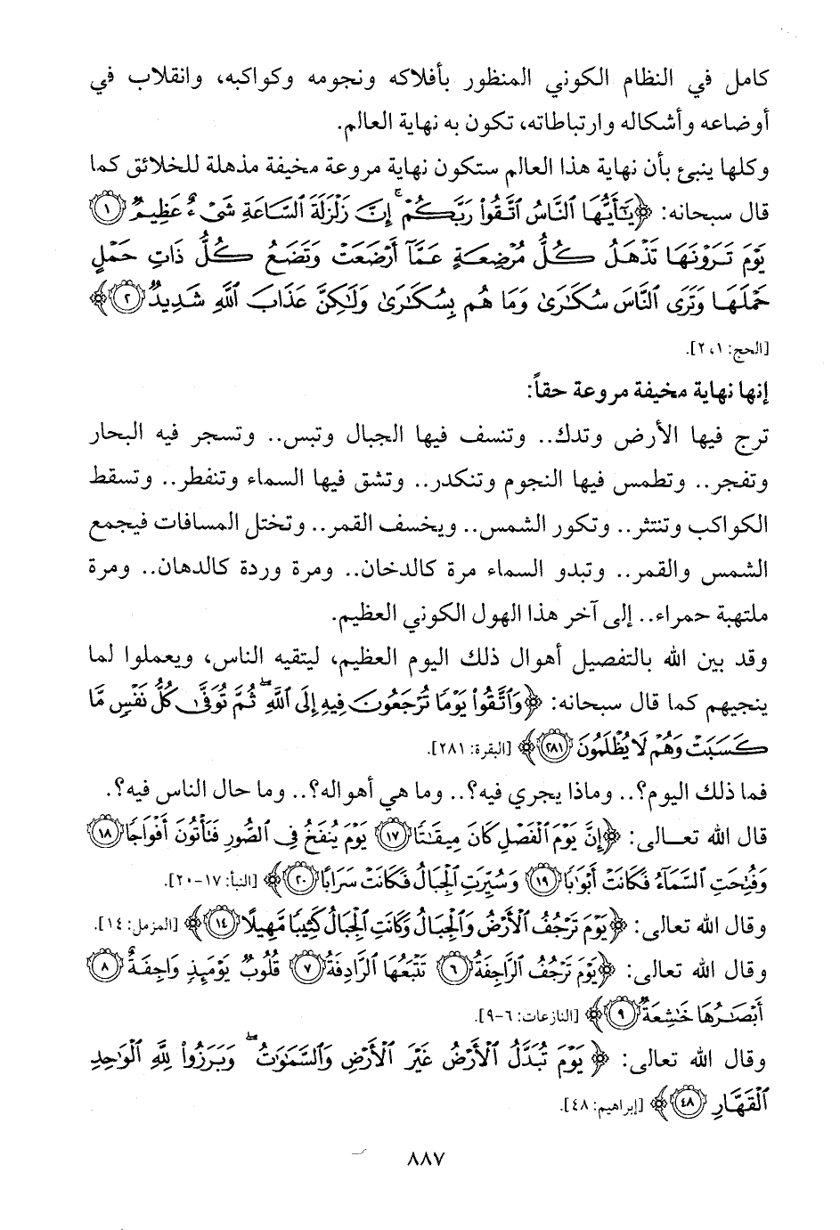 وكلها ينبئ بأن نهاية هذا العالم ستكون نهاية مروعة مخيفة مذهلة للخلائق كما قال سبحانه: {يَاأَيُّهَا النَّاسُ اتَّقُوا رَبَّكُمْ إِنَّ زَلْزَلَةَ السَّاعَةِ شَيْءٌ عَظِيمٌ (1) يَوْمَ تَرَوْنَهَا تَذْهَلُ كُلُّ مُرْضِعَةٍ عَمَّا أَرْضَعَتْ وَتَضَعُ كُلُّ ذَاتِ حَمْلٍ حَمْلَهَا وَتَرَى النَّاسَ سُكَارَى وَمَا هُمْ بِسُكَارَى وَلَكِنَّ عَذَابَ اللَّهِ شَدِيدٌ (2)} [الحج: 1، 2].