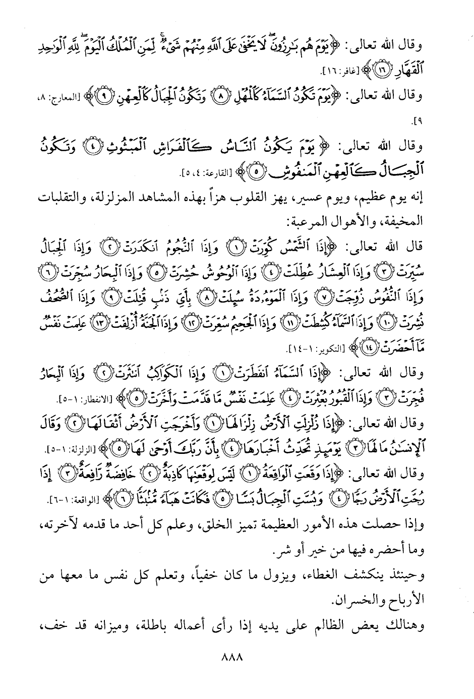 قال الله تعالى: {إِذَا الشَّمْسُ كُوِّرَتْ (1) وَإِذَا النُّجُومُ انْكَدَرَتْ (2) وَإِذَا الْجِبَالُ سُيِّرَتْ (3) وَإِذَا الْعِشَارُ عُطِّلَتْ (4) وَإِذَا الْوُحُوشُ حُشِرَتْ (5) وَإِذَا الْبِحَارُ سُجِّرَتْ (6) وَإِذَا النُّفُوسُ زُوِّجَتْ (7) وَإِذَا الْمَوْءُودَةُ سُئِلَتْ (8) بِأَيِّ ذَنْبٍ قُتِلَتْ (9) وَإِذَا الصُّحُفُ نُشِرَتْ (10) وَإِذَا السَّمَاءُ كُشِطَتْ (11) وَإِذَا الْجَحِيمُ سُعِّرَتْ (12) وَإِذَا الْجَنَّةُ أُزْلِفَتْ (13) عَلِمَتْ نَفْسٌ مَا أَحْضَرَتْ (14)} [التكوير: 1 - 14].