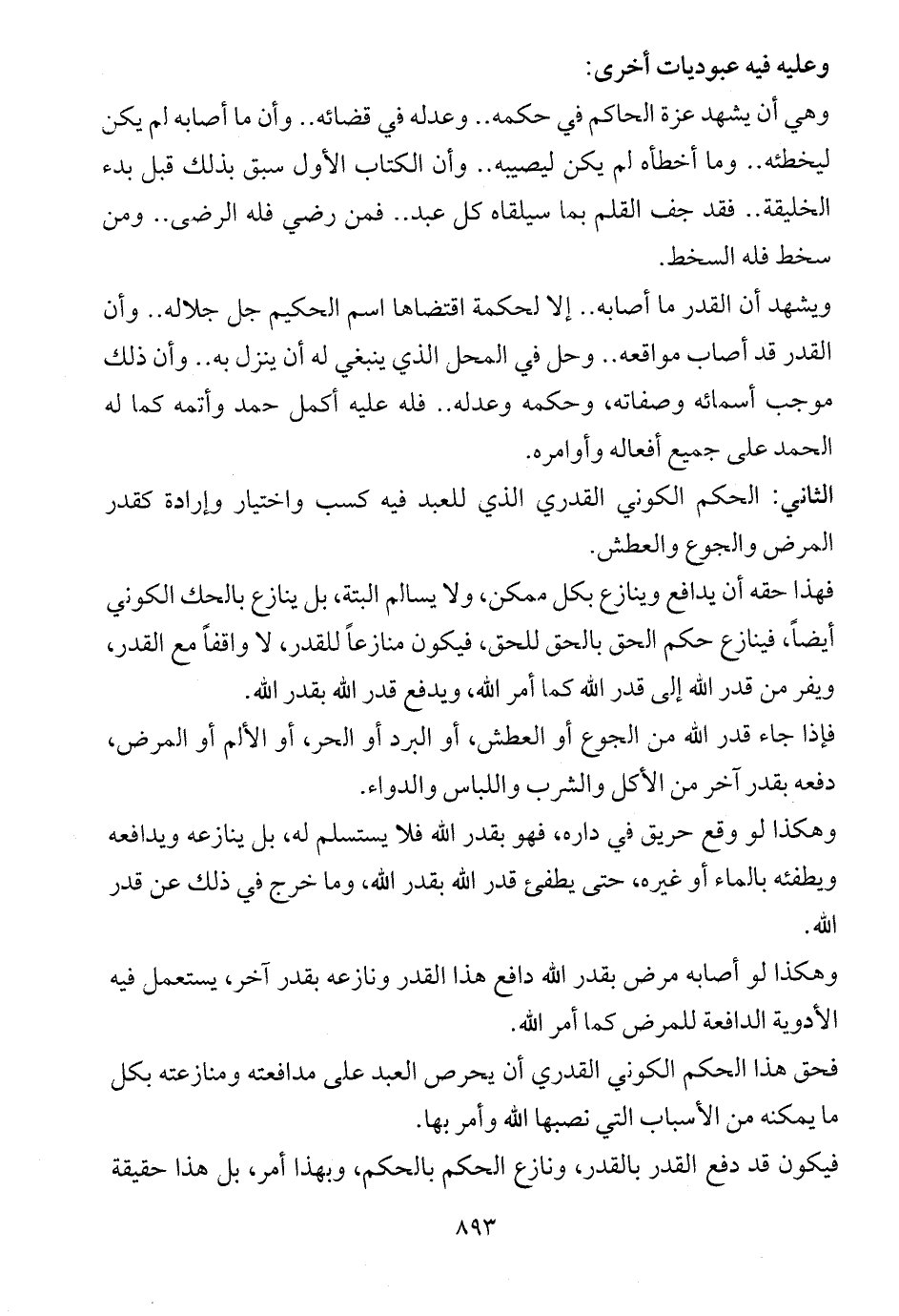 ويشهد أن القدر ما أصابه .. إلا لحكمة اقتضاها اسم الحكيم جل جلاله .. وأن القدر قد أصاب مواقعه .. وحل في المحل الذي ينبغي له أن ينزل به .. وأن ذلك موجب أسمائه وصفاته، وحكمه وعدله .. فله عليه أكمل حمد وأتمه كما له الحمد على جميع أفعاله وأوامره.