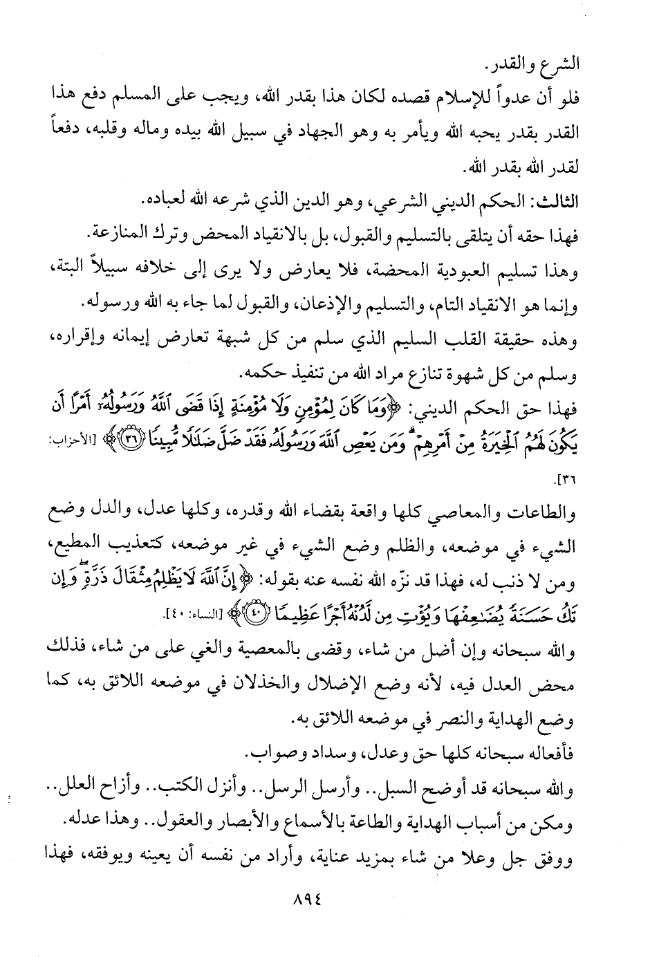 والطاعات والمعاصي كلها واقعة بقضاء الله وقدره، وكلها عدل، والدل وضع الشيء في موضعه، والظلم وضع الشيء في غير موضعه، كتعذيب المطيع، ومن لا ذنب له، فهذا قد نزّه الله نفسه عنه بقوله: {إِنَّ اللَّهَ لَا يَظْلِمُ مِثْقَالَ ذَرَّةٍ وَإِنْ تَكُ حَسَنَةً يُضَاعِفْهَا وَيُؤْتِ مِنْ لَدُنْهُ أَجْرًا عَظِيمًا (40)} [النساء: 40].