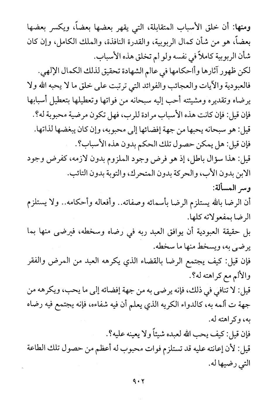 فالعبودية والآيات والعجائب والفوائد التي ترتبت على خلق ما لا يحبه الله ولا يرضاه وتقديره ومشيئته أحب إليه سبحانه من فواتها وتعطيلها بتعطيل أسبابها فإن قيل: فإن كانت هذه الأسباب مرادة للرب، فهل تكون مرضية محبوبة له؟.