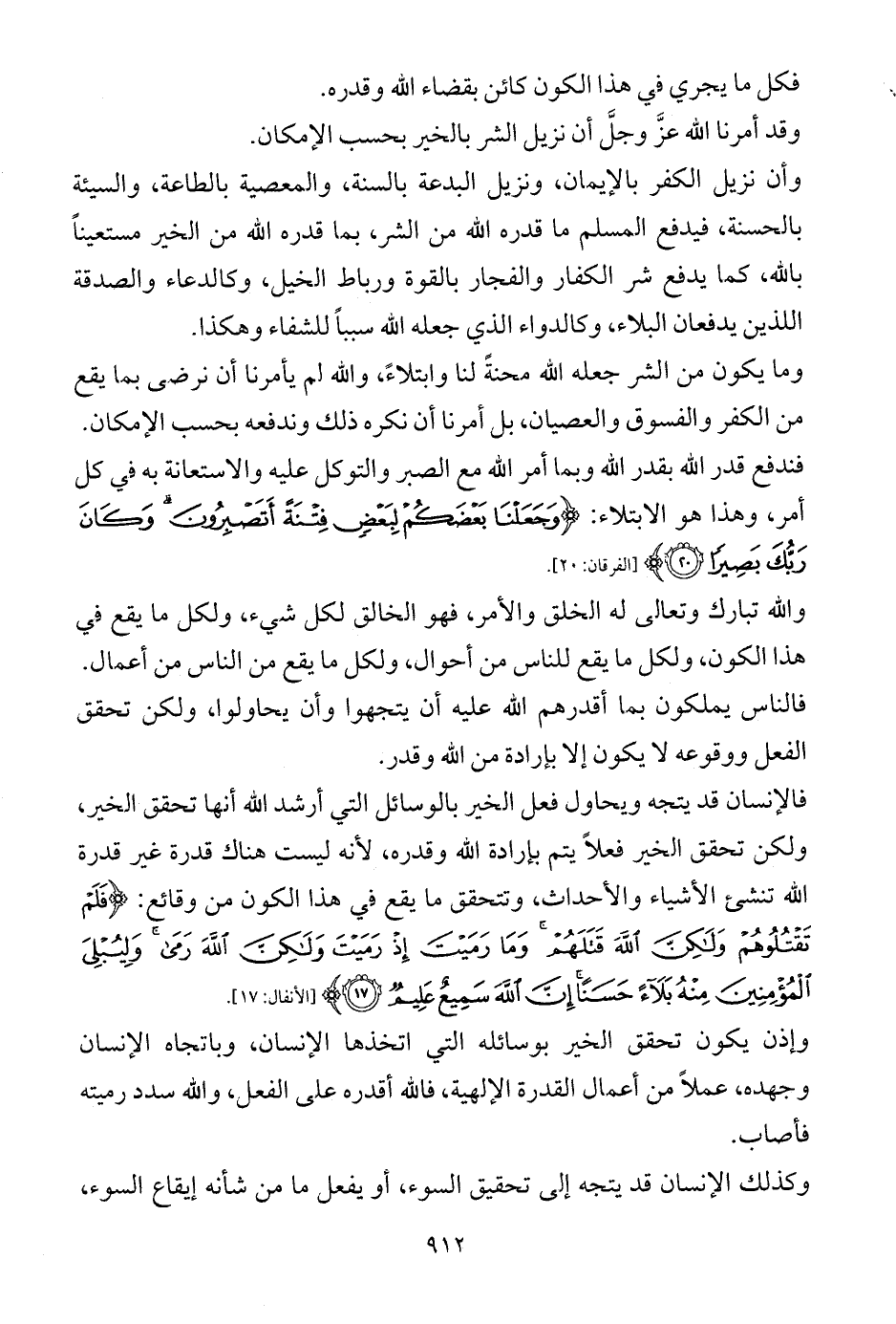 فالإنسان قد يتجه ويحاول فعل الخير بالوسائل التي أرشد الله أنها تحقق الخير، ولكن تحقق الخير فعلاً يتم بإرادة الله وقدره، لأنه ليست هناك قدرة غير قدرة الله تنشئ الأشياء والأحداث، وتتحقق ما يقع في هذا الكون من وقائع: {فَلَمْ تَقْتُلُوهُمْ وَلَكِنَّ اللَّهَ قَتَلَهُمْ وَمَا رَمَيْتَ إِذْ رَمَيْتَ وَلَكِنَّ اللَّهَ رَمَى وَلِيُبْلِيَ الْمُؤْمِنِينَ مِنْهُ بَلَاءً حَسَنًا إِنَّ اللَّهَ سَمِيعٌ عَلِيمٌ (17)} [الأنفال: 17].