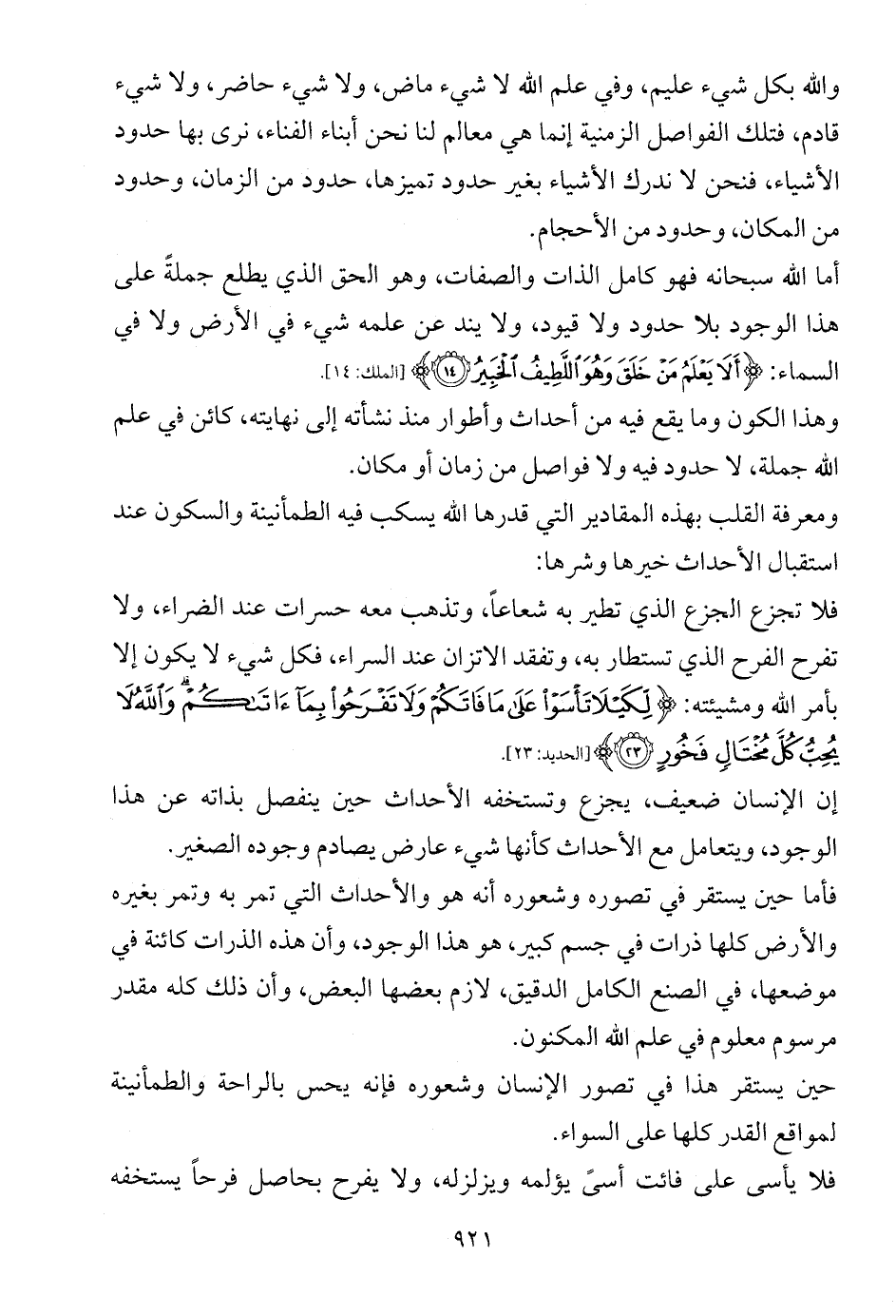 والله بكل شيء عليم، وفي علم الله لا شيء ماض، ولا شيء حاضر، ولا شيء قادم، فتلك الفواصل الزمنية إنما هي معالم لنا نحن أبناء الفناء، نرى بها حدود الأشياء، فنحن لا ندرك الأشياء بغير حدود تميزها، حدود من الزمان، وحدود من المكان، وحدود من الأحجام.