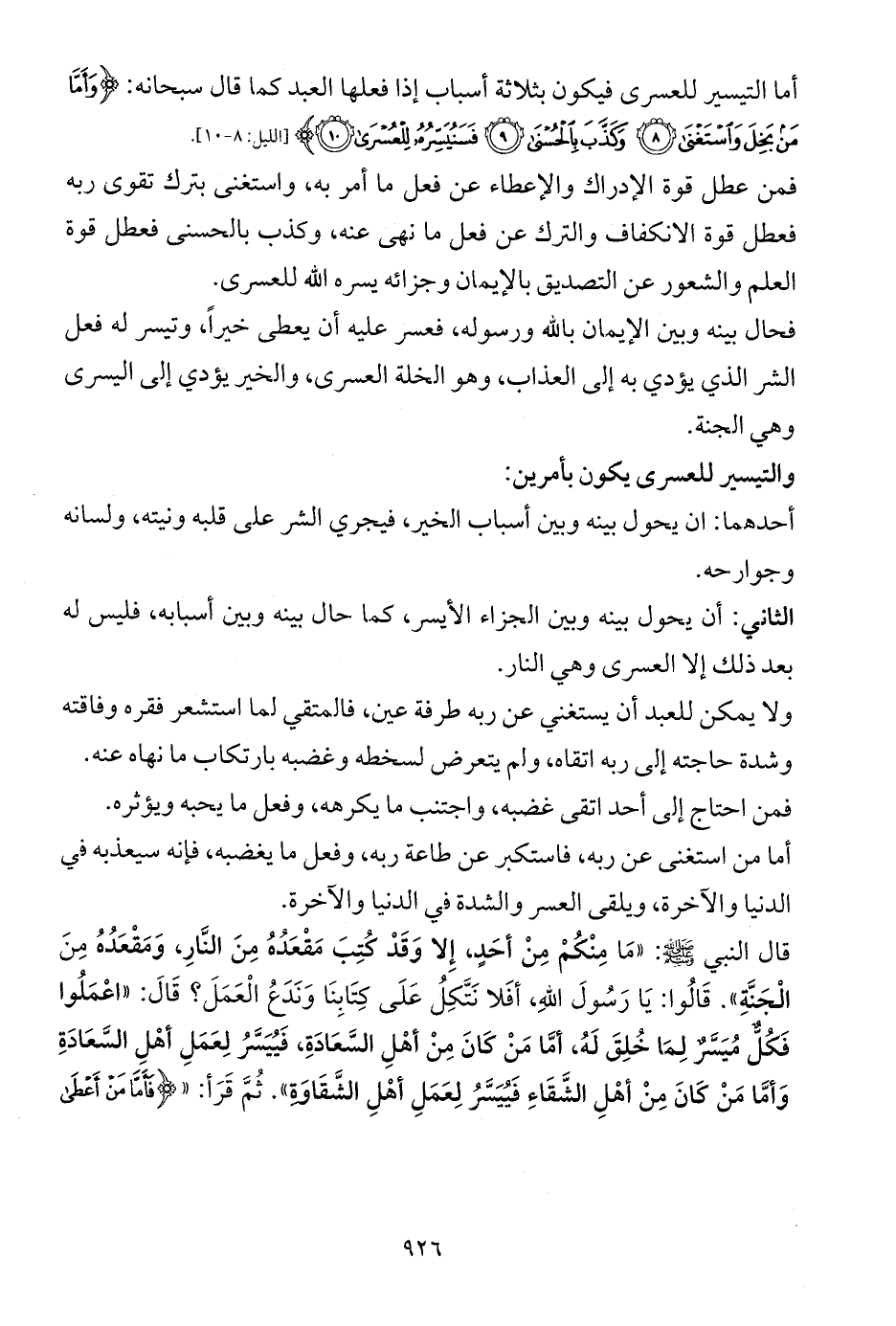 قال النبي - صلى الله عليه وسلم -: «مَا مِنْكُمْ مِنْ أحَدٍ، إِلا وَقَدْ كُتِبَ مَقْعَدُهُ مِنَ النَّارِ، وَمَقْعَدُهُ مِنَ الْجَنَّةِ». قَالُوا: يَا رَسُولَ اللهِ، أفَلا نَتَّكِلُ عَلَى كِتَابِنَا وَنَدَعُ الْعَمَلَ؟ قَالَ: «اعْمَلُوا فَكُلٌّ مُيَسَّرٌ لِمَا خُلِقَ لَهُ، أمَّا مَنْ كَانَ مِنْ أهْلِ السَّعَادَةِ، فَيُيَسَّرُ لِعَمَلِ أهْلِ السَّعَادَةِ وَأمَّا مَنْ كَانَ مِنْ أهْلِ الشَّقَاءِ فَيُيَسَّرُ لِعَمَلِ أهْلِ الشَّقَاوَةِ». ثُمَّ قَرَأ: «{فَأَمَّا مَنْ أَعْطَى