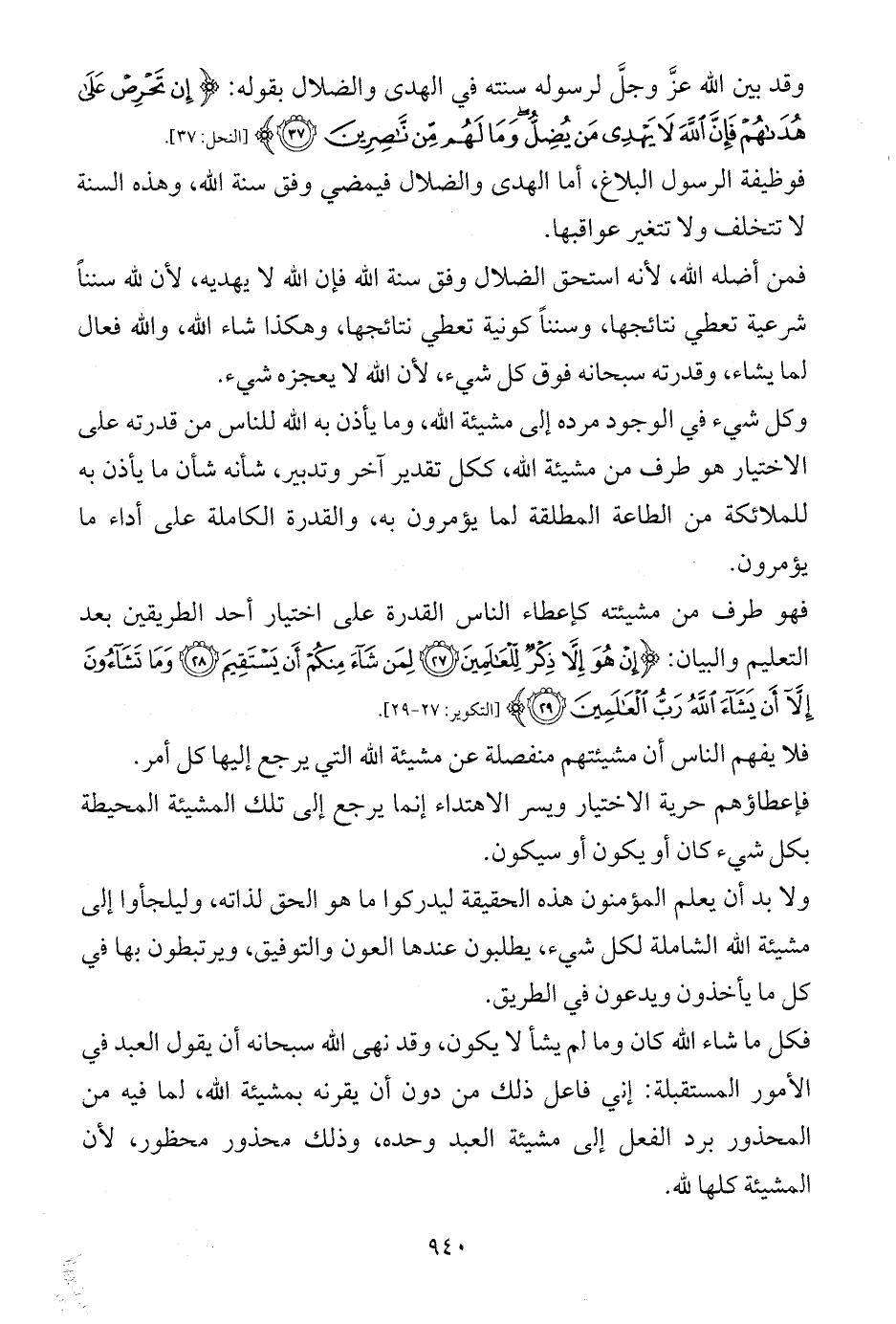 وقد بين الله عزَّ وجلَّ لرسوله سنته في الهدى والضلال بقوله: {إِنْ تَحْرِصْ عَلَى هُدَاهُمْ فَإِنَّ اللَّهَ لَا يَهْدِي مَنْ يُضِلُّ وَمَا لَهُمْ مِنْ نَاصِرِينَ (37)} [النحل: 37].