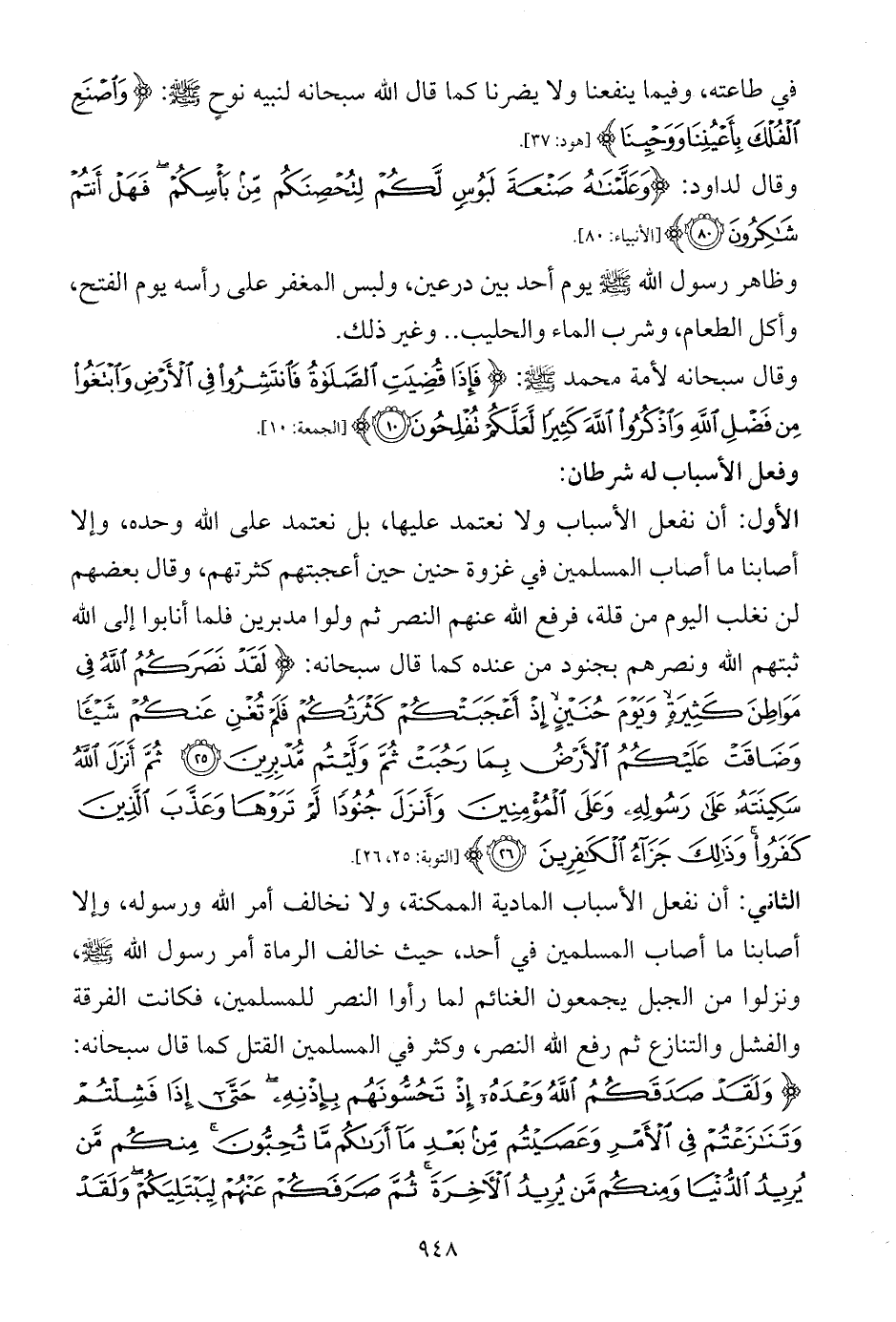 الأول: أن نفعل الأسباب ولا نعتمد عليها، بل نعتمد على الله وحده، وإلا أصابنا ما أصاب المسلمين في غزوة حنين حين أعجبتهم كثرتهم، وقال بعضهم لن نغلب اليوم من قلة، فرفع الله عنهم النصر ثم ولوا مدبرين فلما أنابوا إلى الله ثبتهم الله ونصرهم بجنود من عنده كما قال سبحانه: {لَقَدْ نَصَرَكُمُ اللَّهُ فِي مَوَاطِنَ كَثِيرَةٍ وَيَوْمَ حُنَيْنٍ إِذْ أَعْجَبَتْكُمْ كَثْرَتُكُمْ فَلَمْ تُغْنِ عَنْكُمْ شَيْئًا وَضَاقَتْ عَلَيْكُمُ الْأَرْضُ بِمَا رَحُبَتْ ثُمَّ وَلَّيْتُمْ مُدْبِرِينَ (25) ثُمَّ أَنْزَلَ اللَّهُ سَكِينَتَهُ عَلَى رَسُولِهِ وَعَلَى الْمُؤْمِنِينَ وَأَنْزَلَ جُنُودًا لَمْ تَرَوْهَا وَعَذَّبَ الَّذِينَ كَفَرُوا وَذَلِكَ جَزَاءُ الْكَافِرِينَ (26)} [التوبة: 25، 26].