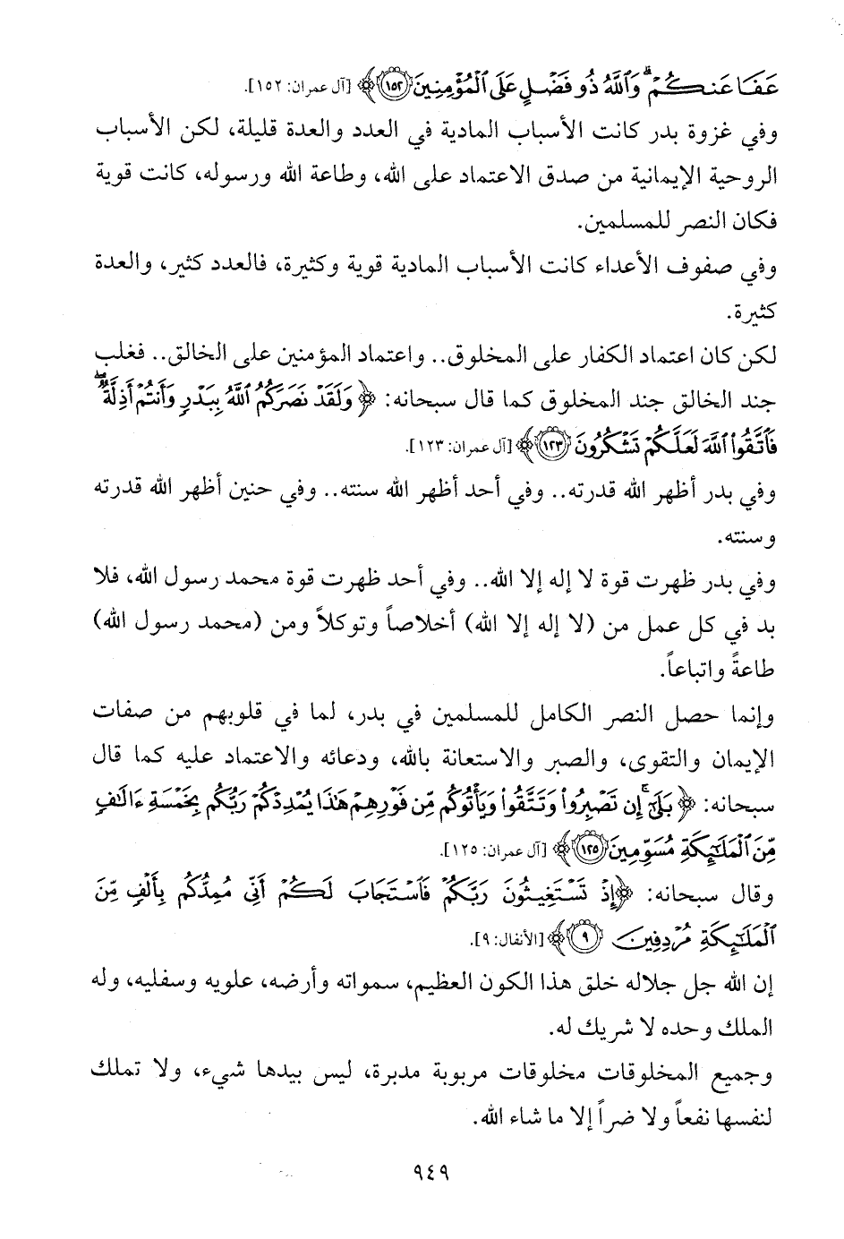 وإنما حصل النصر الكامل للمسلمين في بدر، لما في قلوبهم من صفات الإيمان والتقوى، والصبر والاستعانة بالله، ودعائه والاعتماد عليه كما قال سبحانه: {بَلَى إِنْ تَصْبِرُوا وَتَتَّقُوا وَيَأْتُوكُمْ مِنْ فَوْرِهِمْ هَذَا يُمْدِدْكُمْ رَبُّكُمْ بِخَمْسَةِ آلَافٍ مِنَ الْمَلَائِكَةِ مُسَوِّمِينَ (125)} [آل عمران: 125].