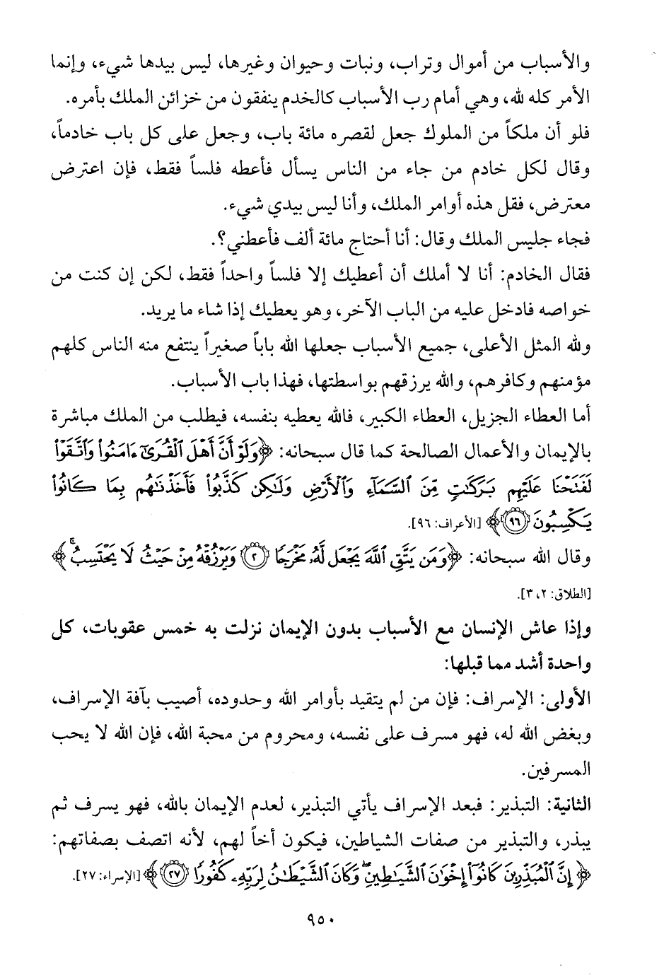وإذا عاش الإنسان مع الأسباب بدون الإيمان نزلت به خمس عقوبات، كل واحدة أشد مما قبلها: