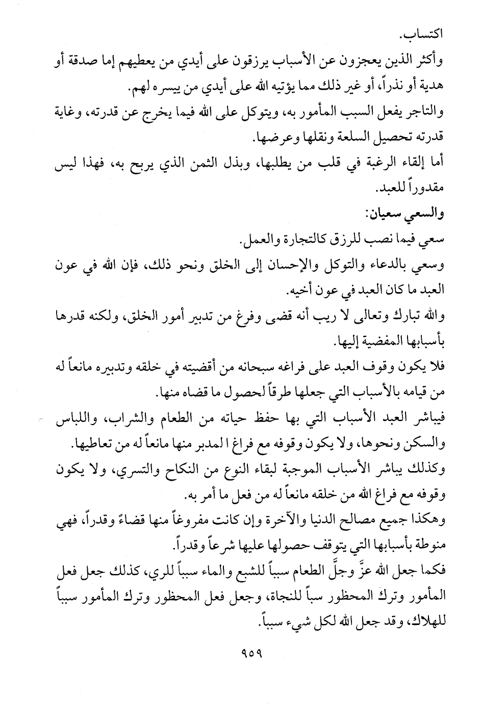 وهكذا جميع مصالح الدنيا والآخرة وإن كانت مفروغاً منها قضاءً وقدراً، فهي منوطة بأسبابها التي يتوقف حصولها عليها شرعاً وقدراً.