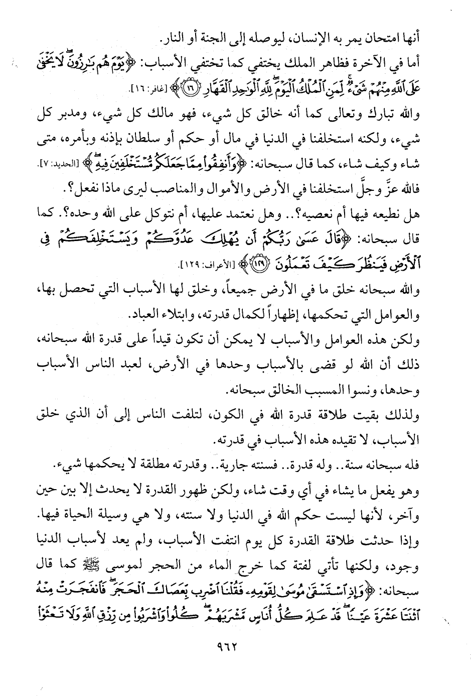 وإذا حدثت طلاقة القدرة كل يوم انتفت الأسباب، ولم يعد لأسباب الدنيا وجود، ولكنها تأتي لفتة كما خرج الماء من الحجر لموسى - صلى الله عليه وسلم - كما قال سبحانه: {وَإِذِ اسْتَسْقَى مُوسَى لِقَوْمِهِ فَقُلْنَا اضْرِبْ بِعَصَاكَ الْحَجَرَ فَانْفَجَرَتْ مِنْهُ اثْنَتَا عَشْرَةَ عَيْنًا قَدْ عَلِمَ كُلُّ أُنَاسٍ مَشْرَبَهُمْ كُلُوا وَاشْرَبُوا مِنْ رِزْقِ اللَّهِ وَلَا تَعْثَوْا