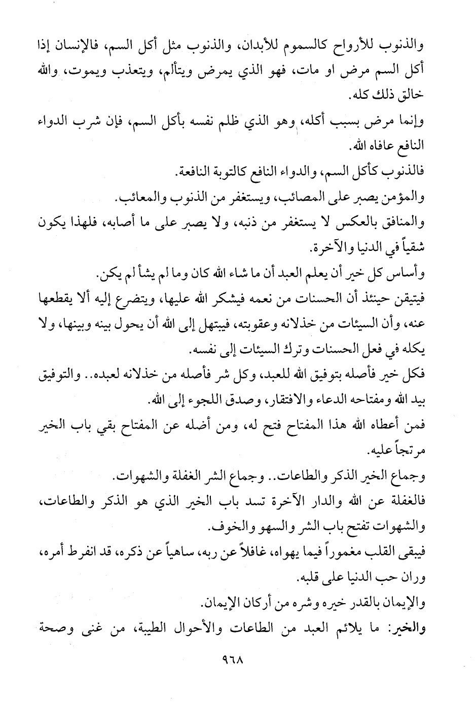 والذنوب للأرواح كالسموم للأبدان، والذنوب مثل أكل السم، فالإنسان إذا أكل السم مرض او مات، فهو الذي يمرض ويتألم، ويتعذب ويموت، والله خالق ذلك كله.