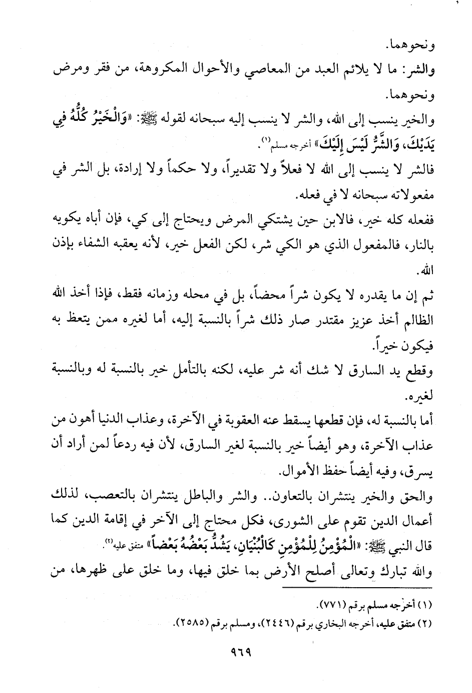 والخير ينسب إلى الله، والشر لا ينسب إليه سبحانه لقوله - صلى الله عليه وسلم -: «وَالْخَيْرُ كُلُّهُ فِي يَدَيْكَ، وَالشَّرُّ لَيْسَ إِلَيْكَ» أخرجه مسلم (¬1).