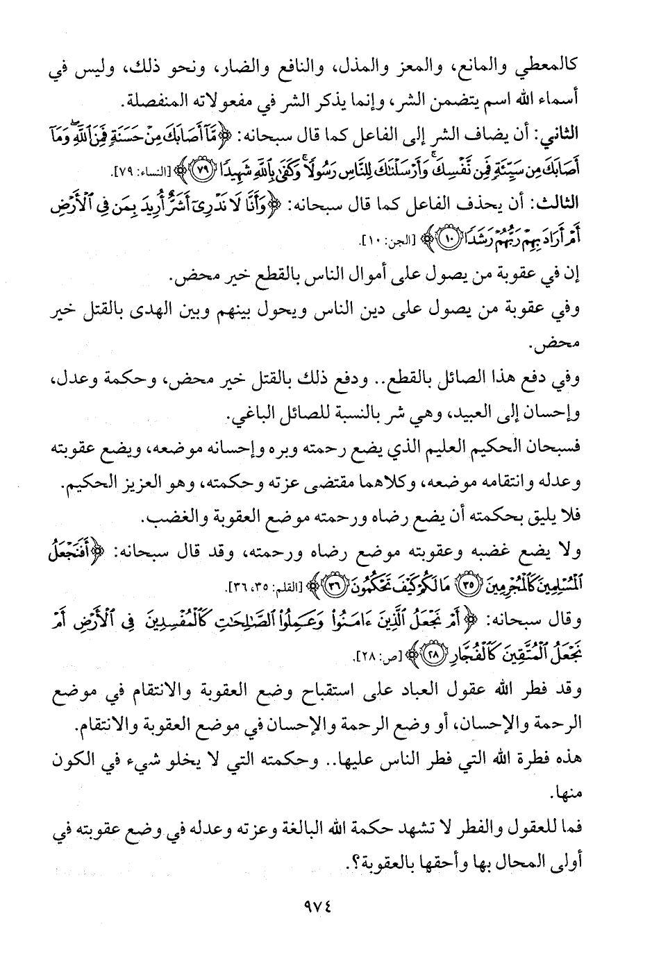 ولا يضع غضبه وعقوبته موضع رضاه ورحمته، وقد قال سبحانه: {أَفَنَجْعَلُ الْمُسْلِمِينَ كَالْمُجْرِمِينَ (35) مَا لَكُمْ كَيْفَ تَحْكُمُونَ (36)} [القلم: 35، 36].