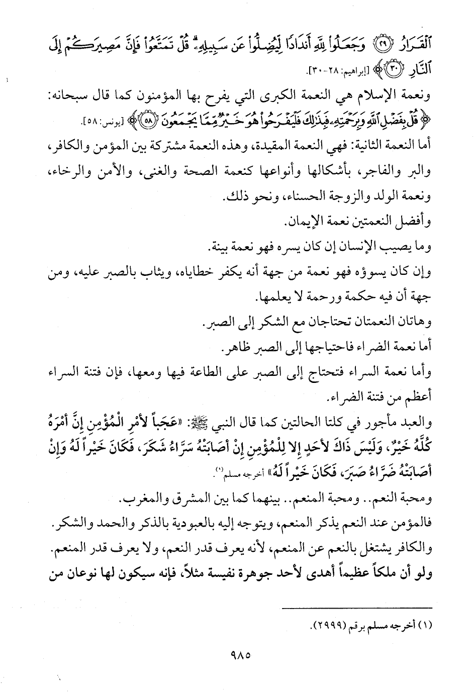 وأما نعمة السراء فتحتاج إلى الصبر على الطاعة فيها ومعها، فإن فتنة السراء أعظم من فتنة الضراء.