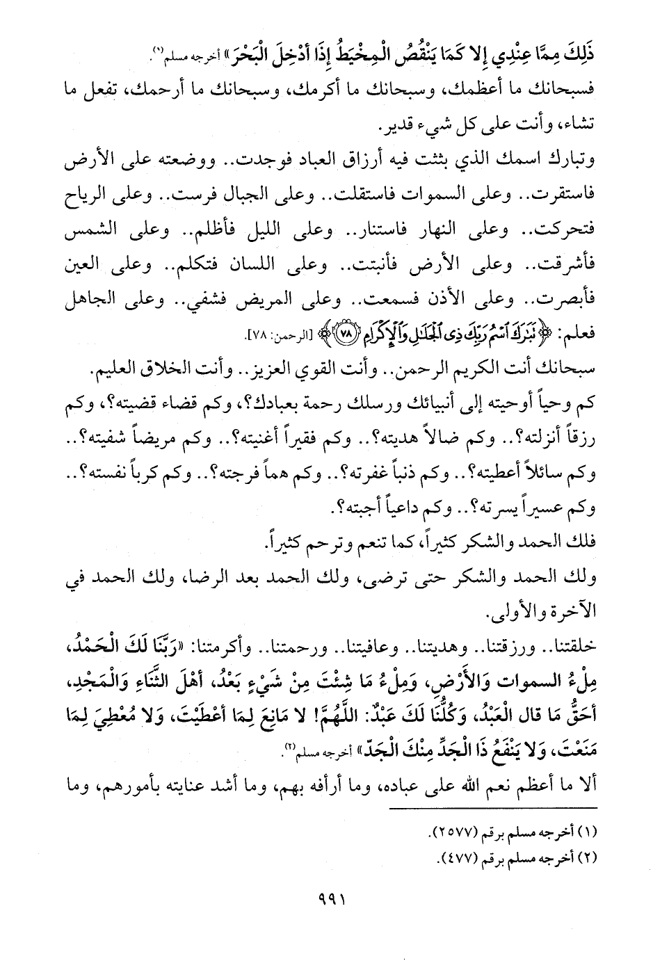 كم وحياً أوحيته إلى أنبيائك ورسلك رحمة بعبادك؟، وكم قضاء قضيته؟، وكم رزقاً أنزلته؟ .. وكم ضالاً هديته؟ .. وكم فقيراً أغنيته؟ .. وكم مريضاً شفيته؟ .. وكم سائلاً أعطيته؟ .. وكم ذنباً غفرته؟ .. وكم هماً فرجته؟ .. وكم كرباً نفسته؟ .. وكم عسيراً يسرته؟ .. وكم داعياً أجبته؟.