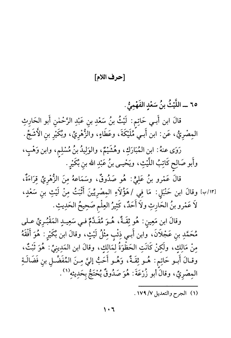 قال ابن أبي حاتم: ليث بن سعد بن عبد الرحمن أبو الحارث المصري، عن: ابن أبي مليكة، وعطاء، والزهري، وبكير بن الأشج.