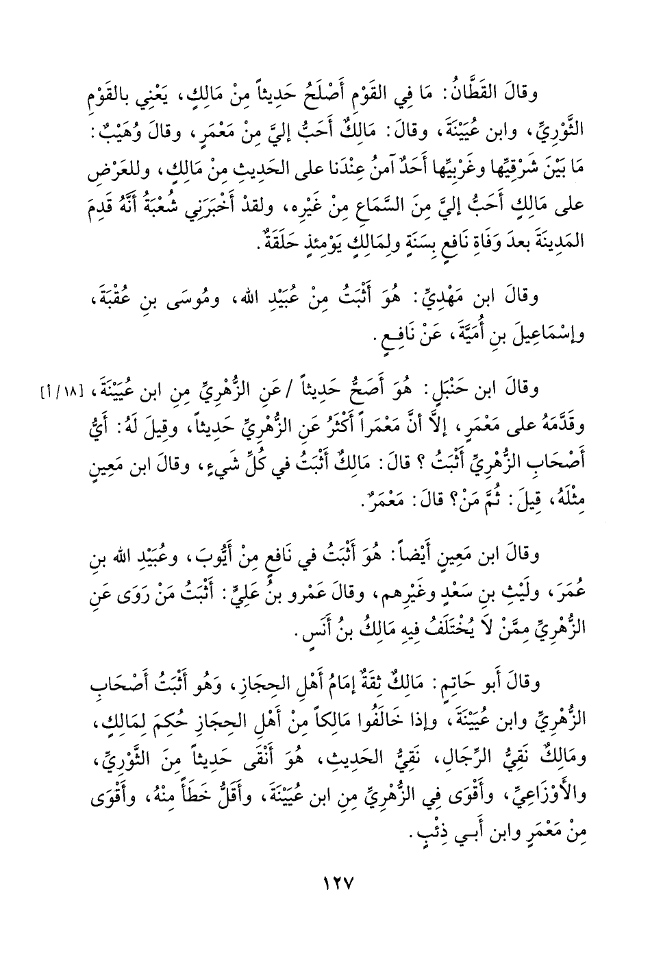وقال أبو حاتم: مالك ثقة إمام أهل الحجاز، وهو أثبت أصحاب الزهري وابن عيينة، وإذا خالفوا مالكاً من أهل الحجاز حكم لمالك، ومالك نقي الرجال، نقي الحديث، هو أنقى حديثاً من الثوري، والأوزاعي، وأقوى في الزهري من ابن عيينة، وأقل خطأ منه، وأقوى من معمر وابن أبي ذئب.