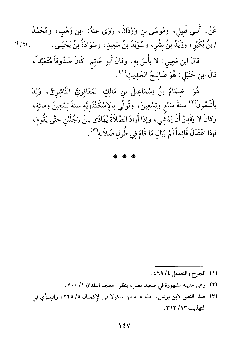 هو: ضمام بن إسماعيل بن مالك المعافري الناشري، ولد بأشمون سنة سبعٍ وتسعين، وتوفي بالإسكندرية سنة تسعين ومائةٍ، وكان لا يقدر أن يمشي، وإذا أراد الصلاة يهادي بين رجلين حتى يقوم، فإذا اعتدل قائما لم يبال ما قام في طول صلاته.