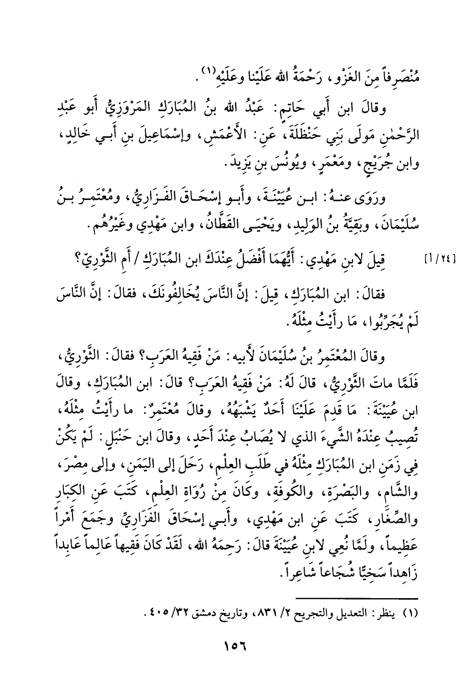 وقال ابن أبي حاتم: عبد الله بن المبارك المروزي أبو عبد الرحمن مولى بني حنظلة، عن: الأعمش، وإسماعيل بن أبي خالد، وابن جريج، ومعمر، ويونس بن يزيد.