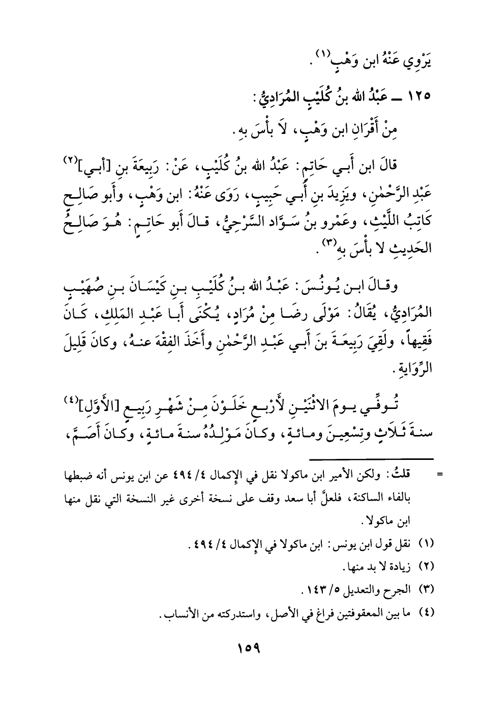 وقال ابن يونس: عبد الله بن كليب بن كيسان بن صهيب المرادي، يقال: مولى رضا من مراد، يكنى أبا عبد الله الملك، كان فقيهاً، ولقي ربيعة بن أبي عبد الرحمن وأخذ الفقه عنه، وكان قليل الرواية.