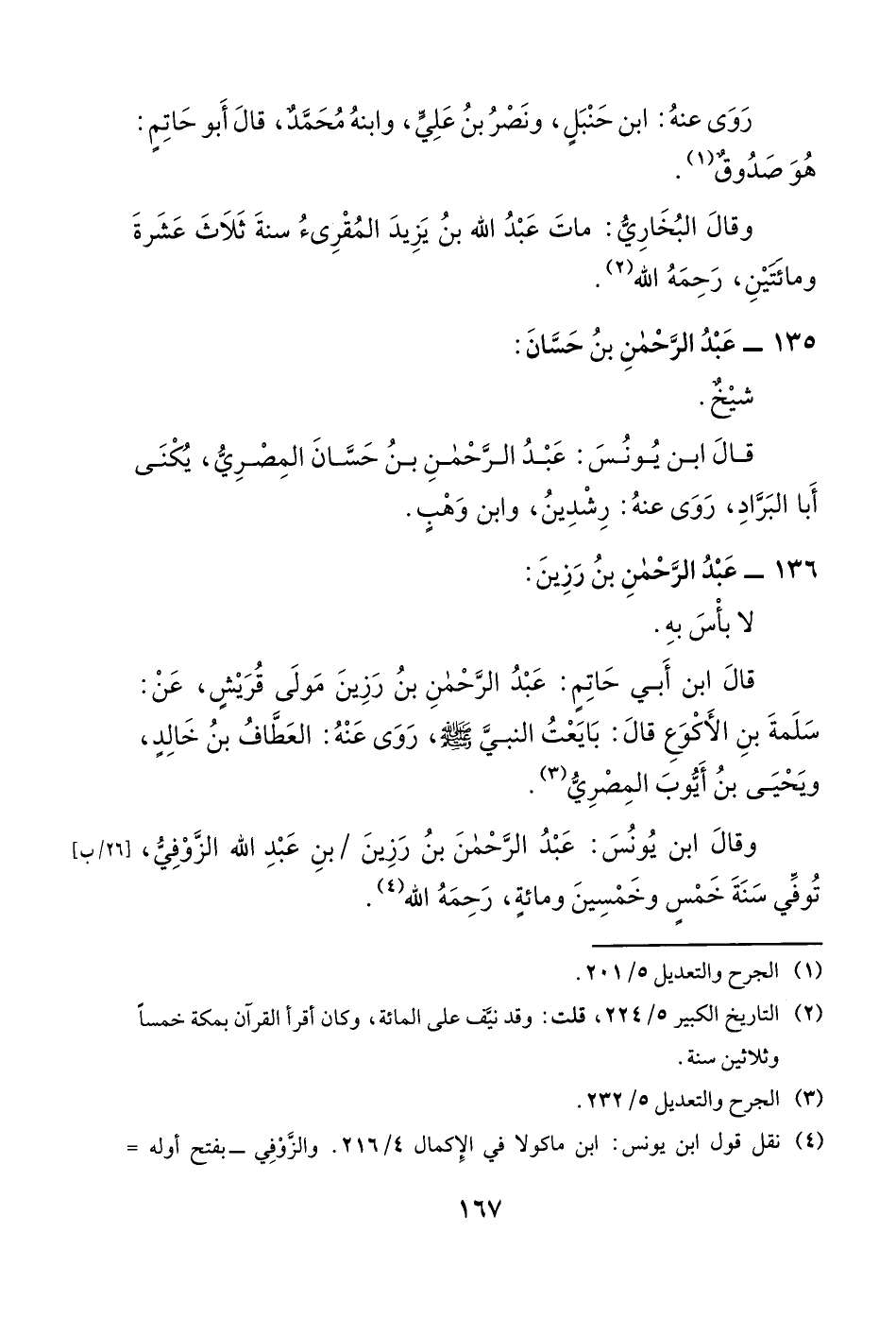 وقال ابن يونس: عبد الرحمن بن رزين بن عبد الله الزوفي، توفي سنة خمسٍ وخمسين ومائةٍ، رحمه الله.