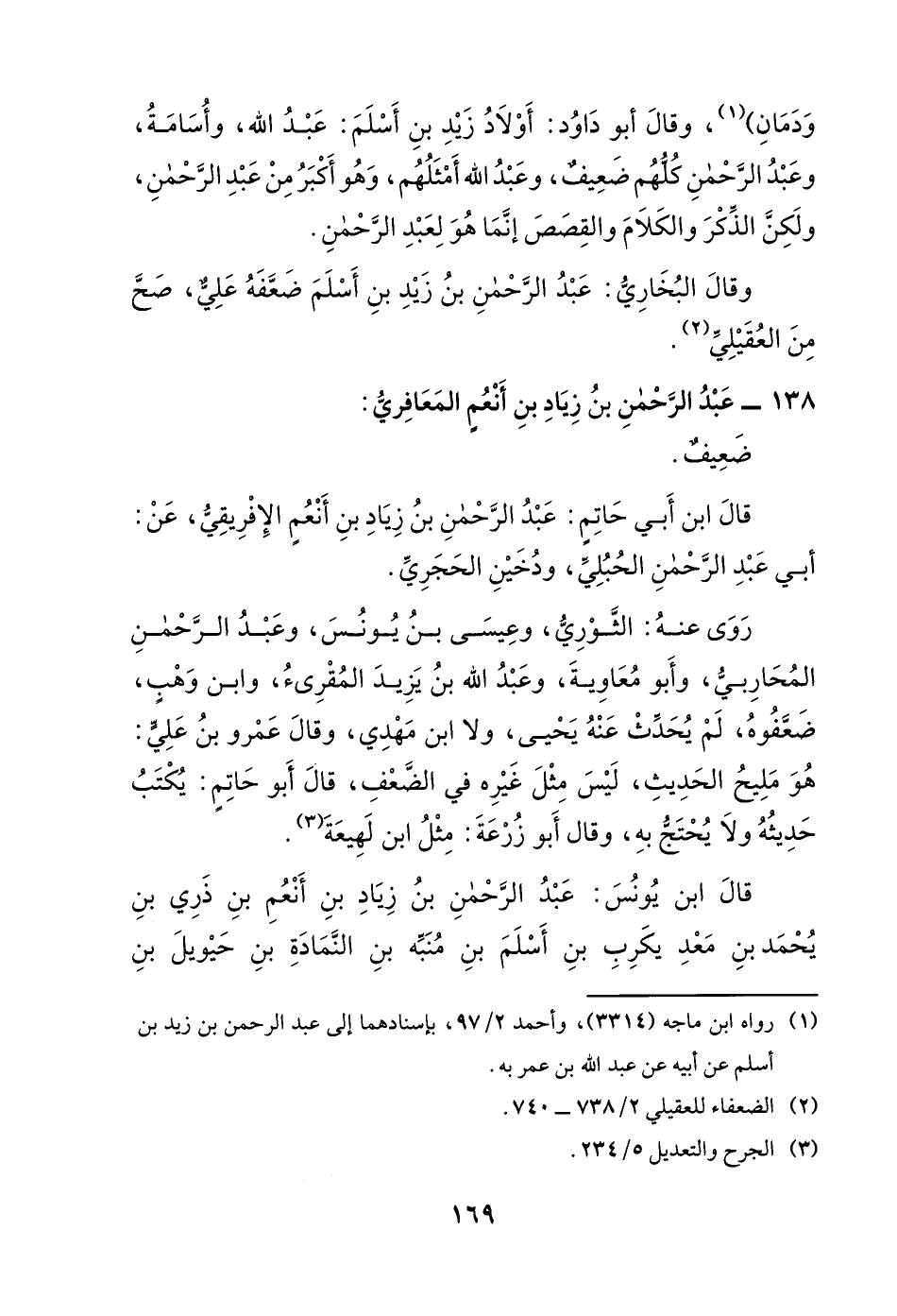 وقال البخاري: عبد الرحمن بن زيد بن أسلم ضعفه علي، صح من العقيلي.