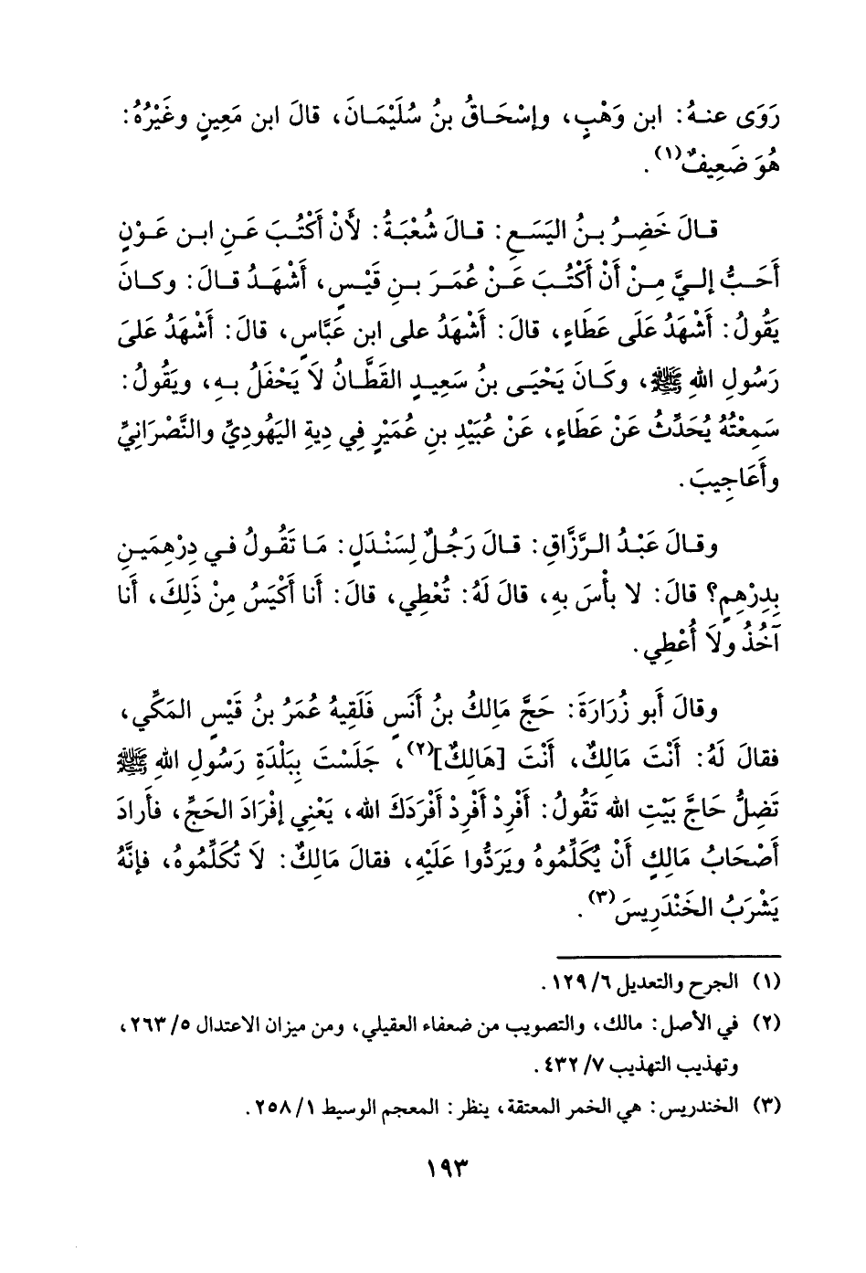 وقال أبو زرارة: حج مالك بن أنس فلقيه عمر بن قيس المكي، فقال له: أنت مالك، أنت [هالك]، جلست ببلدة رسول الله صلى الله عليه وسلم تضل حاج بيت الله تقول: أفرد أفرد أفردك الله، يعني إفراد الحج، فأراد أصحاب مالك أن يكلموه ويردوا عليه، فقال مالك: لا تكلموه، فإنه يشرب الخندريس.