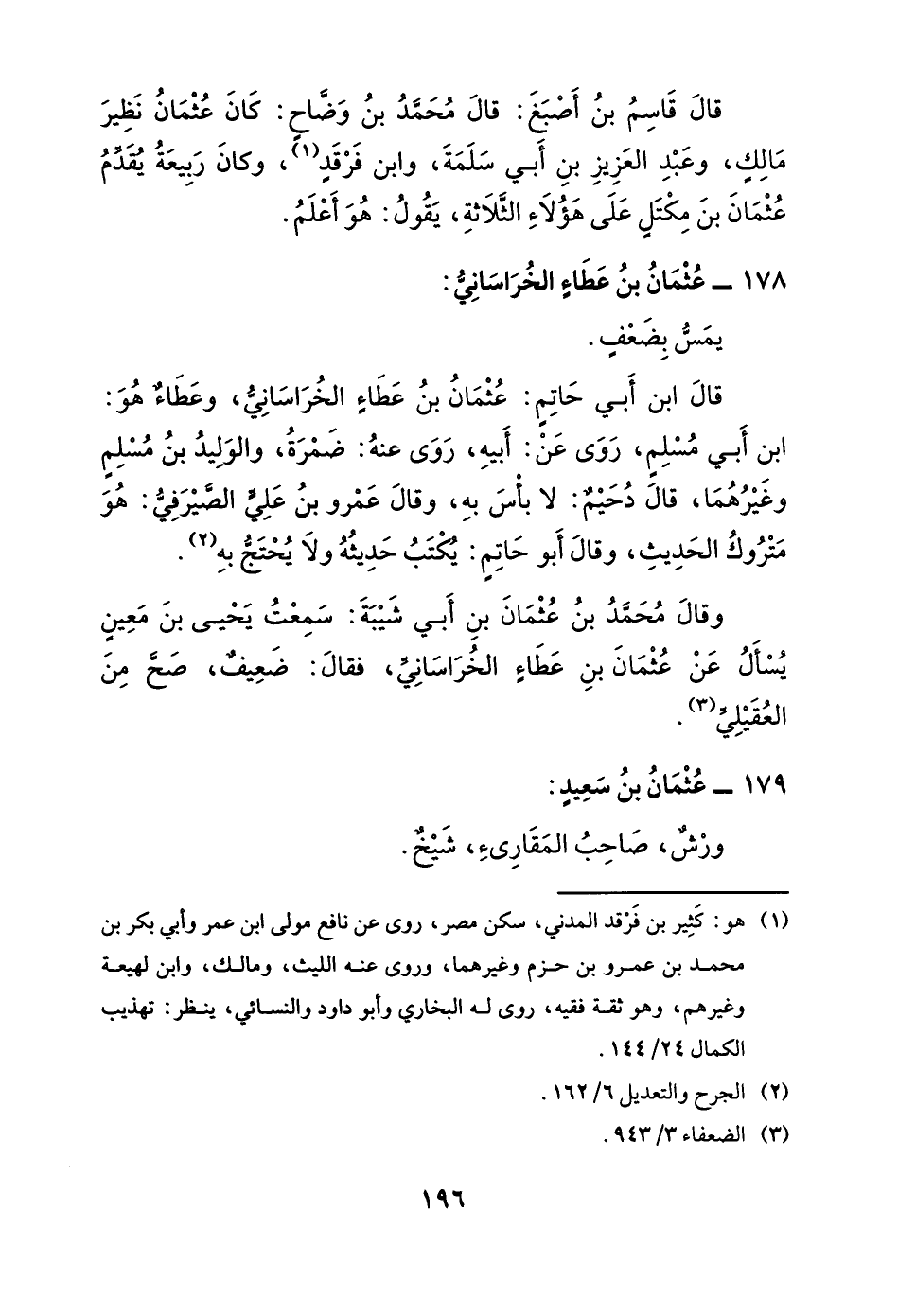 قال ابن أبي حاتم: عثمان بن عطاء الخراساني، وعطاء هو: ابن أبي مسلم، روى عن: أبيه، روى عنه: ضمرة، والوليد بن مسلم وغيرهما، قال دحيم: لا بأس به، وقال عمرو بن علي الصيرفي: هو متروك الحديث، وقال أبو حاتم: يكتب حديثه ولا يحتج به.